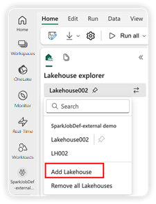 Select Add lakehouse to add more lakehouses to the notebook. You can either add an existing one or create a new one.