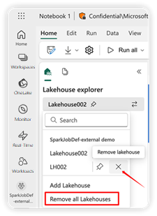 To remove all the lakehouses from the notebook, click "Remove all Lakehouses" in the lakehouse list.
