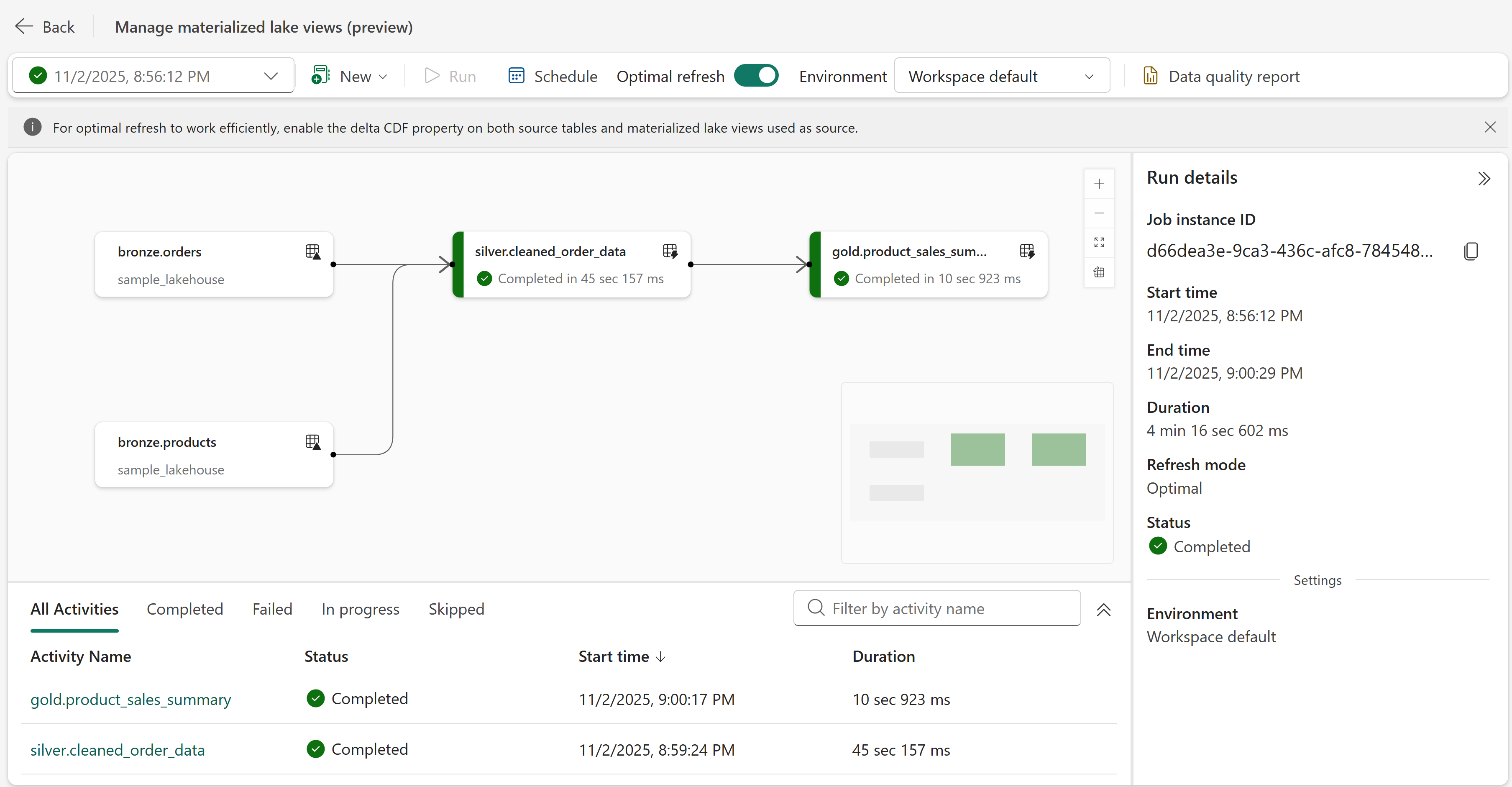 In your lakehouse, go to Manage materialized lake views to view the autogenerated lineage.