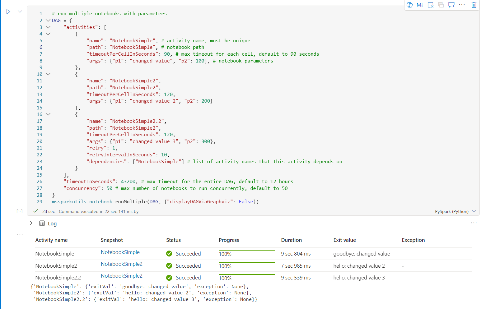 mssparkutils.notebook.run("Sample1", 90, {"input": 20 }, "fe0a6e2a-a909-4aa3-a698-0a651de790aa")