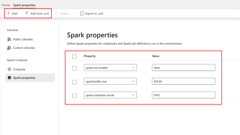 - Once you have Spark configurations, add custom Spark properties to your Environment in Fabric: