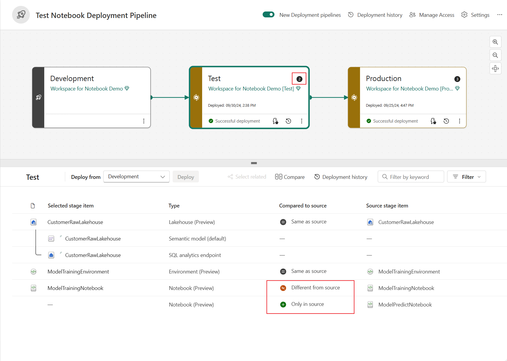 Select, view, and compare items including notebooks between different stages, as shown in the following example. The highlighted badge indicating changed item count between the previous stage and current stage.