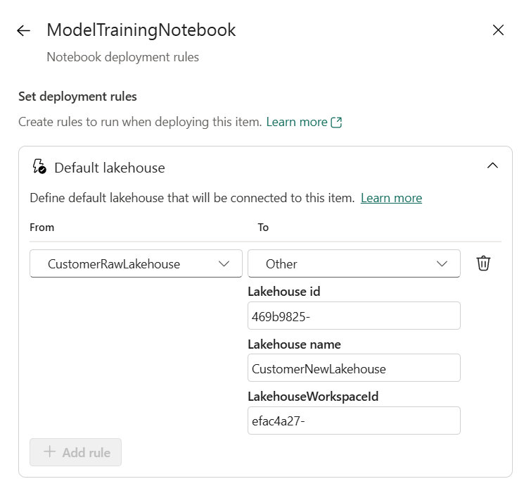 You can achieve secured data isolation by setting up this rule. Your notebook's default lakehouse is replaced by the one you specified as target during deployment.