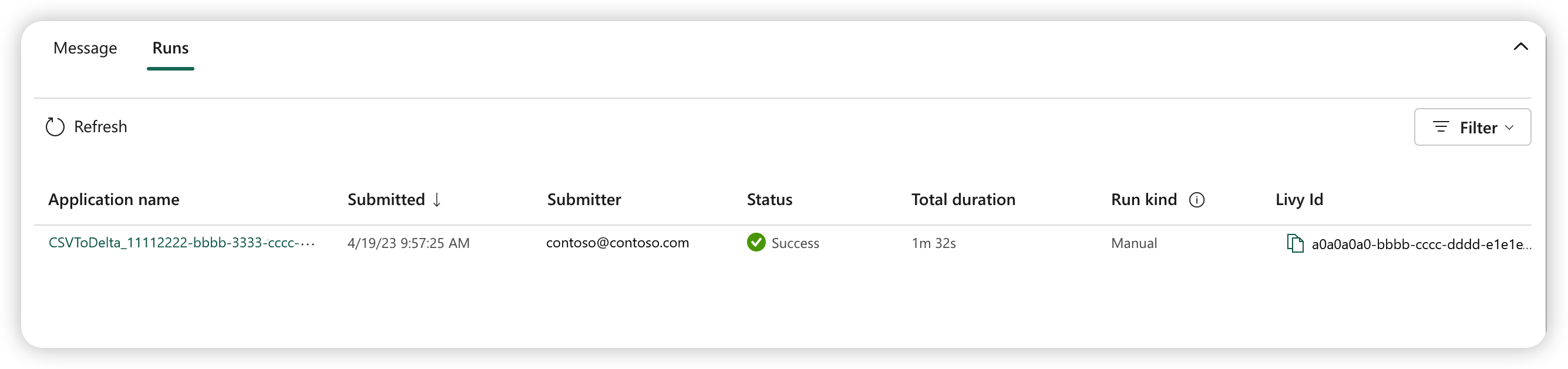 Three to five seconds after you've submitted the run, a new row appears under the Runs tab. The row shows details about your new run. The Status column shows the near real-time status of the job, and the Run kind column shows if the job is manual or scheduled.