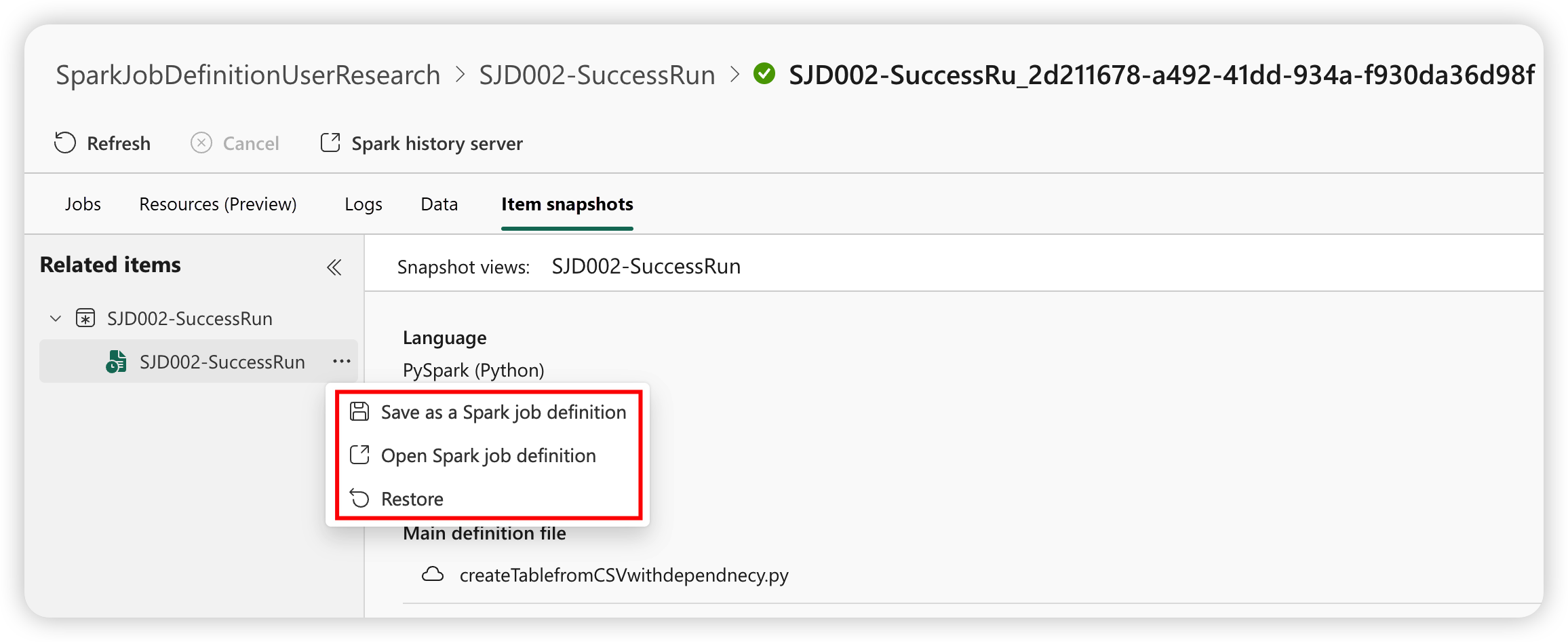 - Save as a Spark job definition: Save the snapshot as a new Spark job definition.