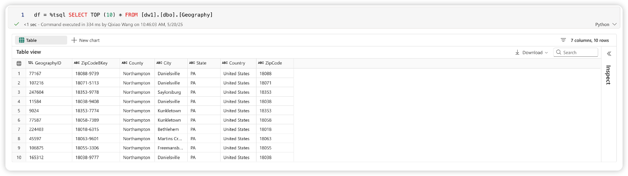 %tsqlin following cells. The line magic will use the connection established in step 1 without requiring you to specify-artifactand-typeagain. For example:df = %tsql SELECT TOP(10) * FROM [ContosoDWH].[dbo].[Geography];