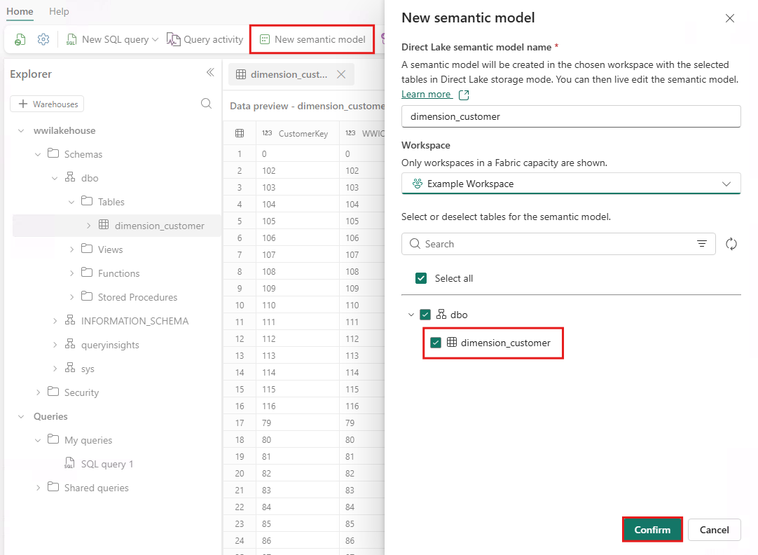Open your lakehouse and switch to the SQL analytics endpoint view, select New semantic model, name the semantic model, assign a workspace, and select the tables that you want to add to the semantic model. In this case, select the dimension_customer table.