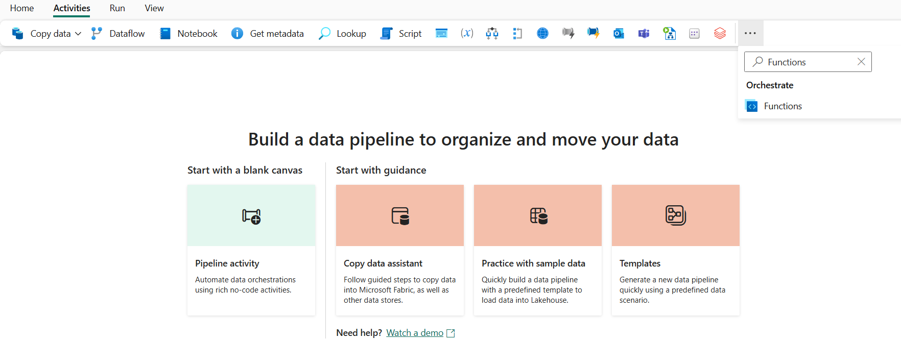 • Search for Functions in the pipeline's Activities pane, then select the found result to add it to the pipeline canvas.