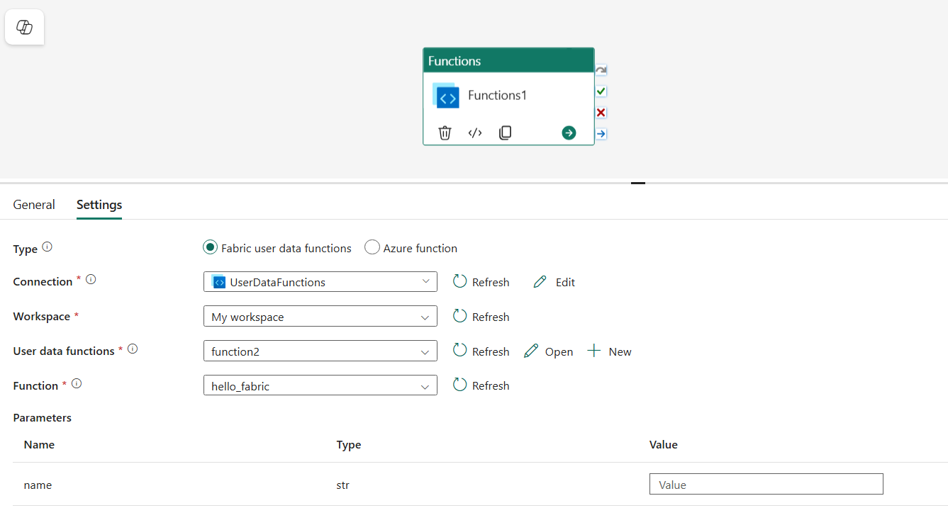 • On the Settings tab, you can then choose UserDataFunctions as the Type of functions activity. Select the workspace, user data functions item, and function name, then provide the input parameters for your selected function.