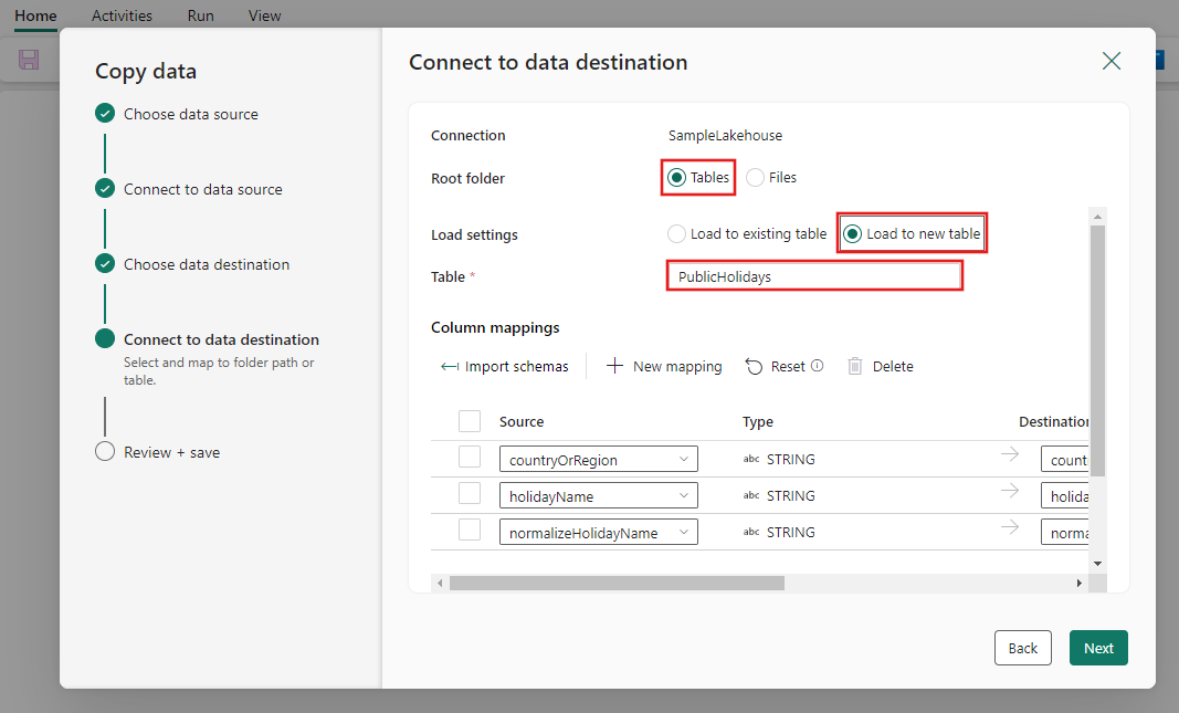 Configure and map your source data to the destination Lakehouse table. Select Tables for the Root folder and Load to new table for Load settings. Provide a Table name and select Next.