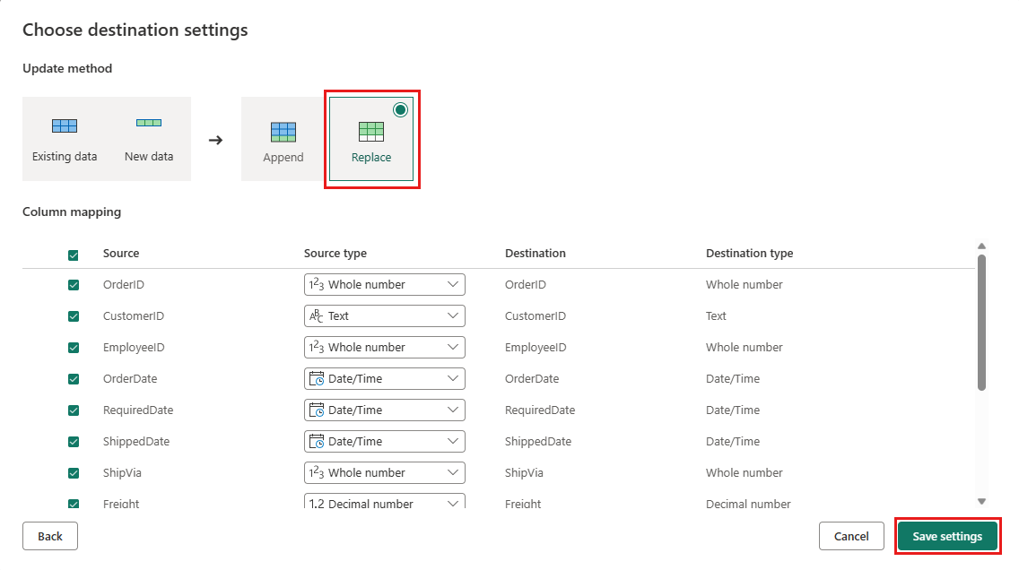 Set up the data destination to your lakehouse using the following settings: