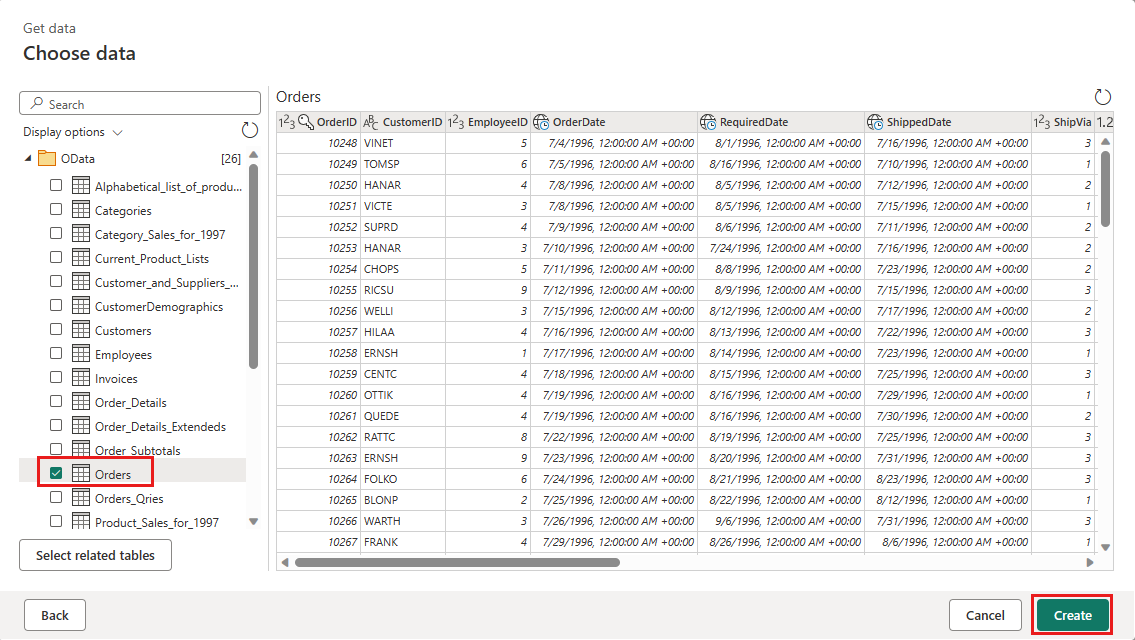 Select the Orders table and select Next.