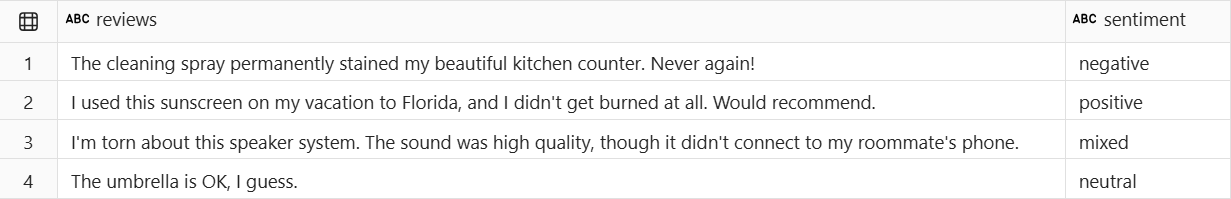 The ai.analyze_sentiment function invokes AI to identify whether the emotional state expressed by input text is positive, negative, mixed, or neutral. If AI can't make this determination, the output is left blank. For more detailed instructions about the use of ai.analyze_sentiment with pandas, see this article. For ai.analyze_sentiment with PySpark, see this article.
