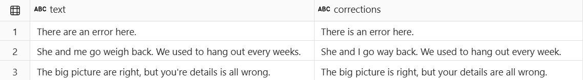 The ai.fix_grammar function invokes AI to correct the spelling, grammar, and punctuation of input text. For more detailed instructions about the use of ai.fix_grammar with pandas, see this article. For ai.fix_grammar with PySpark, see this article.