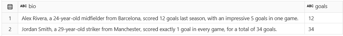Unlike other AI functions, ai.extract returns a pandas DataFrame, instead of a Series, with a separate column for each specified entity type that contains extracted values for each input row.