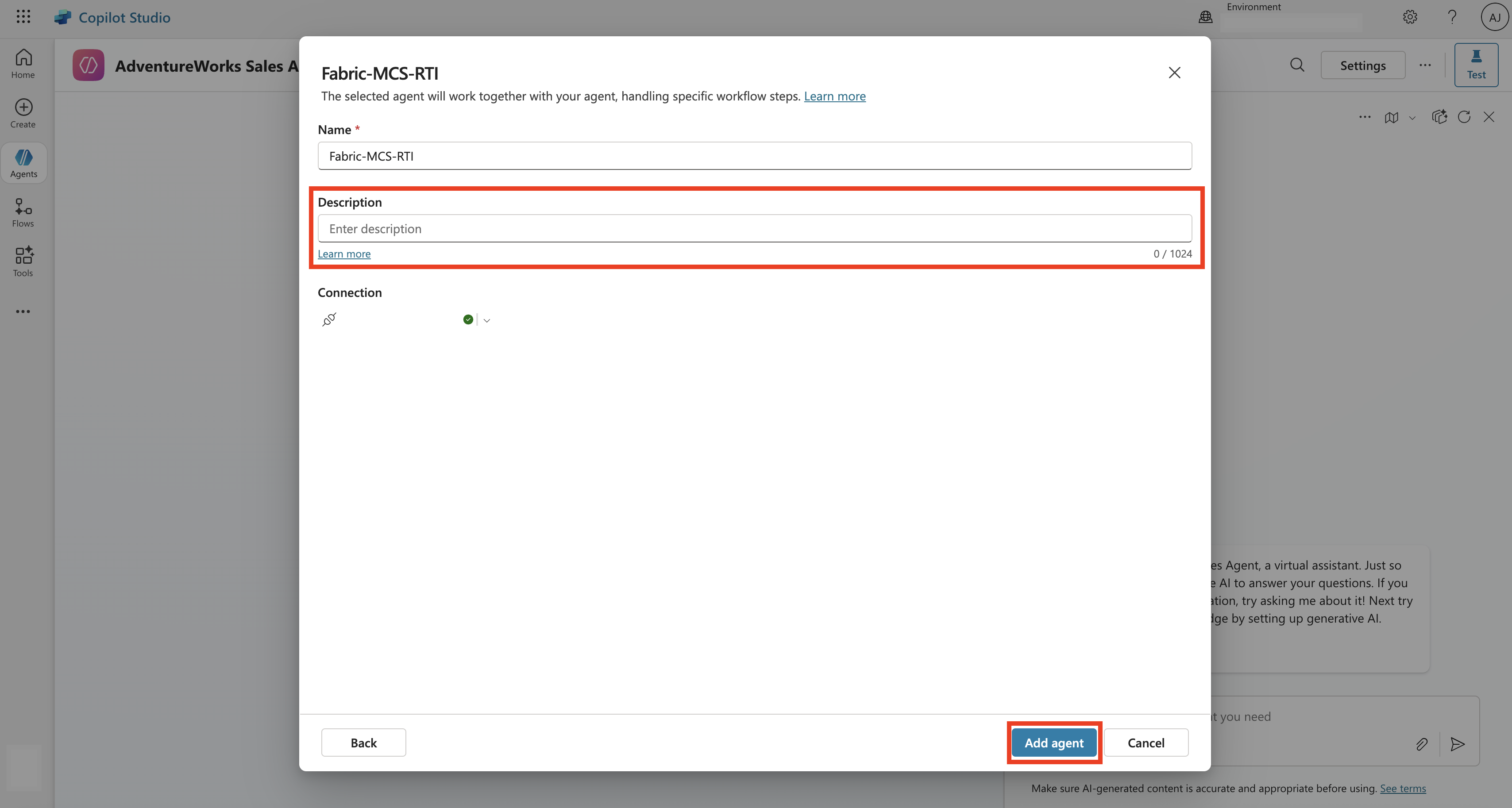 You can adjust the description for the Fabric data agent that you select and then select Add agent. This step adds the Fabric data agent to the custom AI agent in Microsoft Copilot Studio.