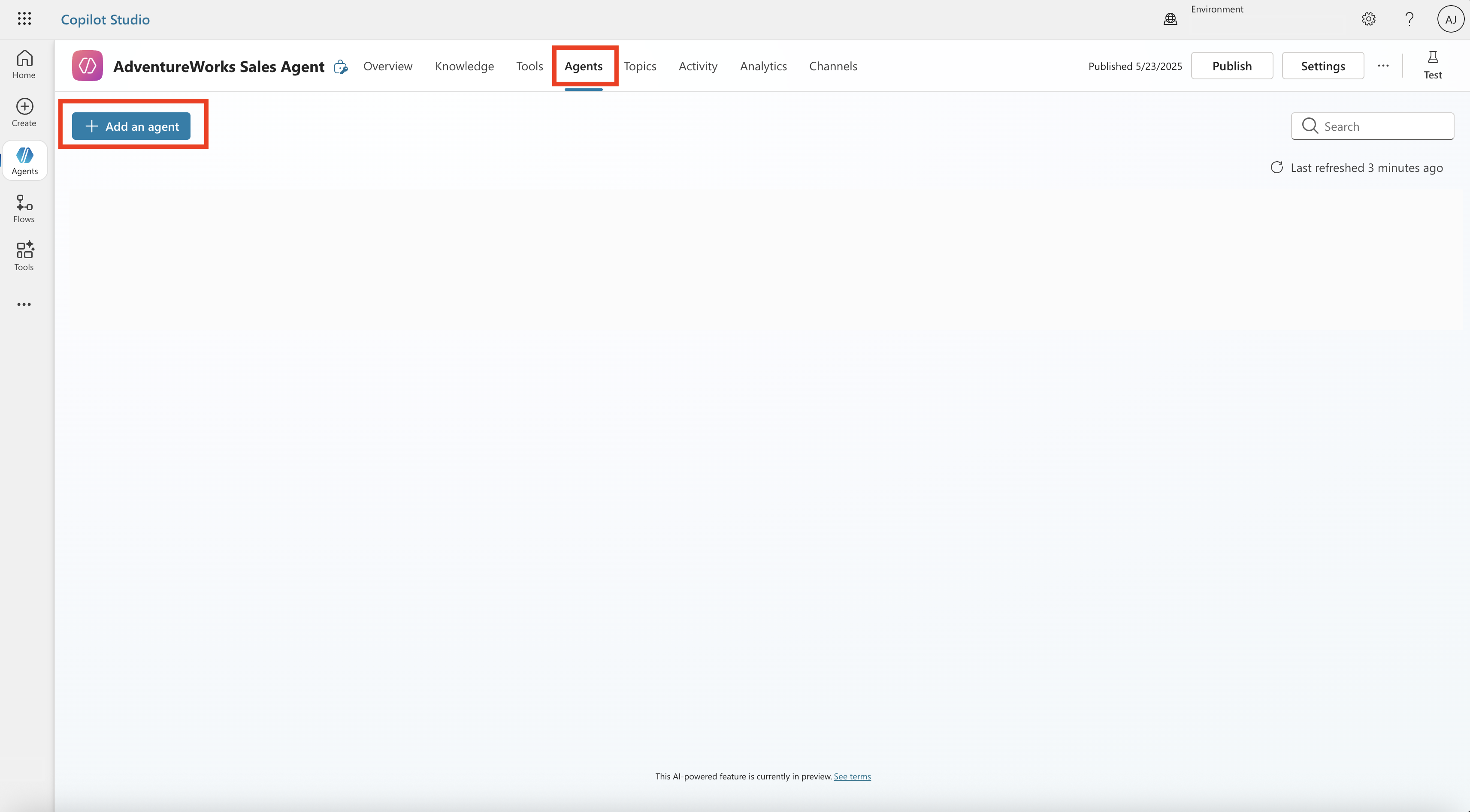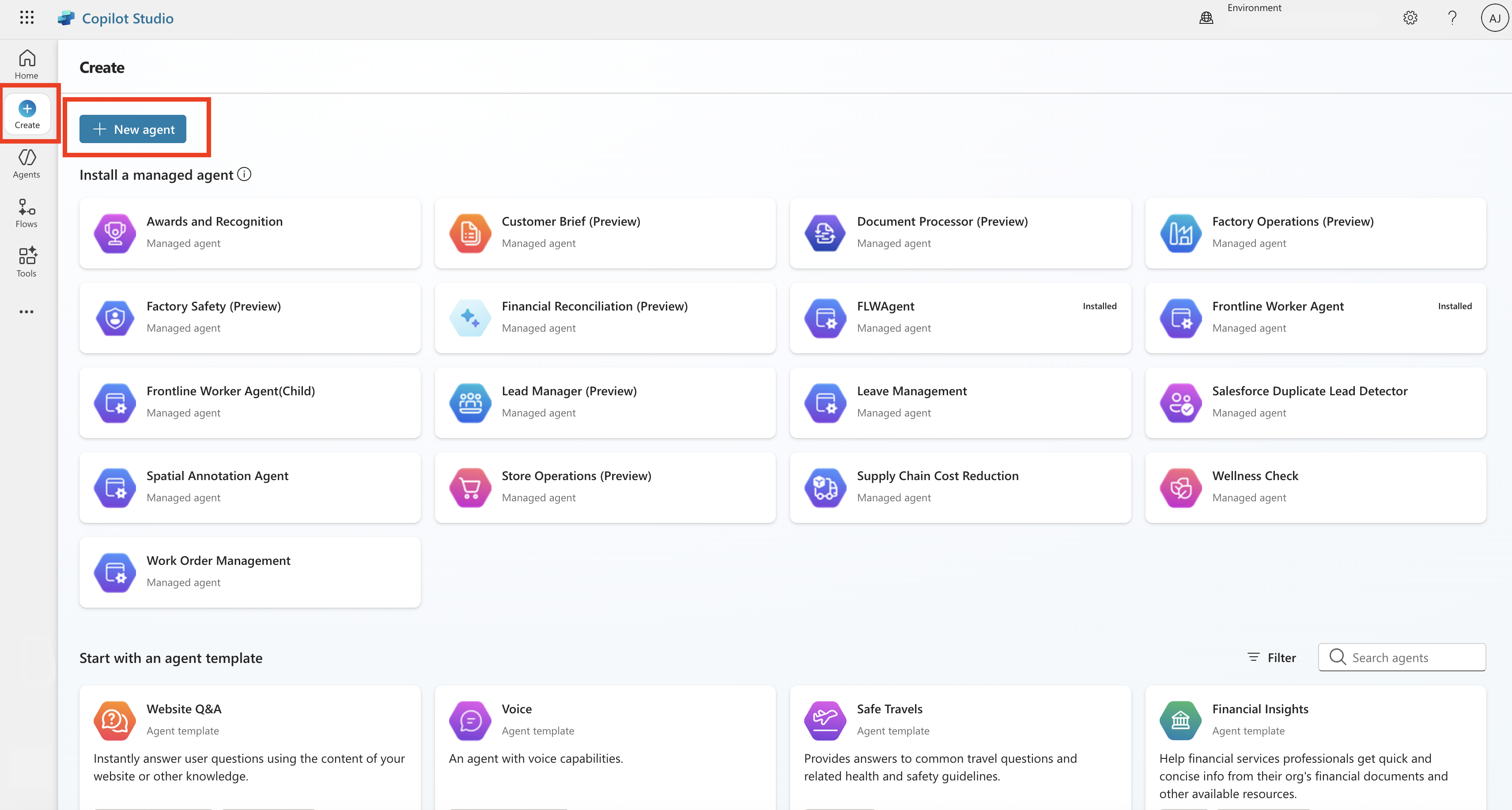 Once you select desired environment, on the left pane, select Create, then select + New agent to start building your custom AI agent. If you already have a custom AI agent, you can skip steps 2 and 3.