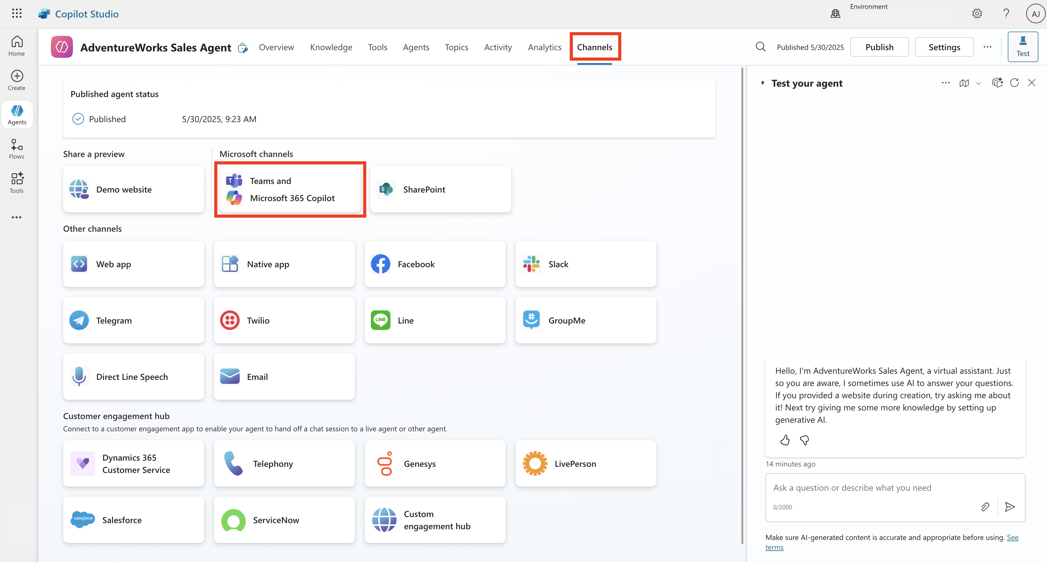 You can publish the custom AI agent and then navigate to the Channels to select your desired consumption channel.