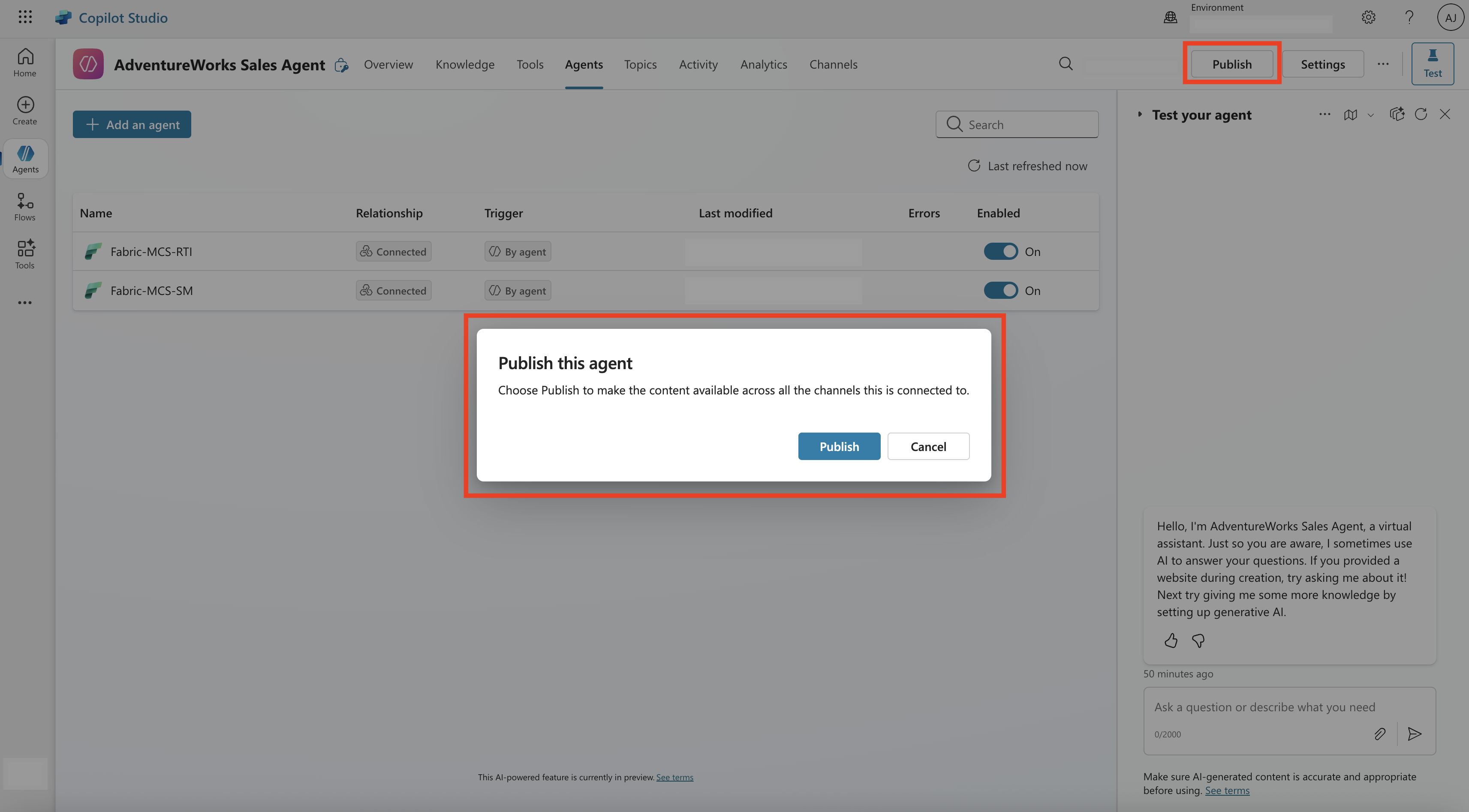 Once done, navigate back to the Agents from the top pane and you should see the Fabric data agent among the agents that are connected to the custom AI agent.