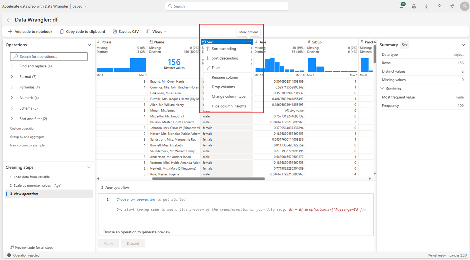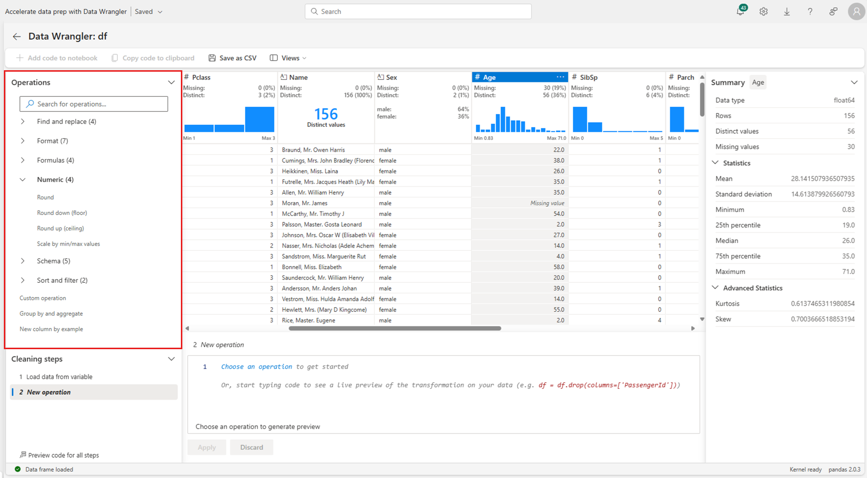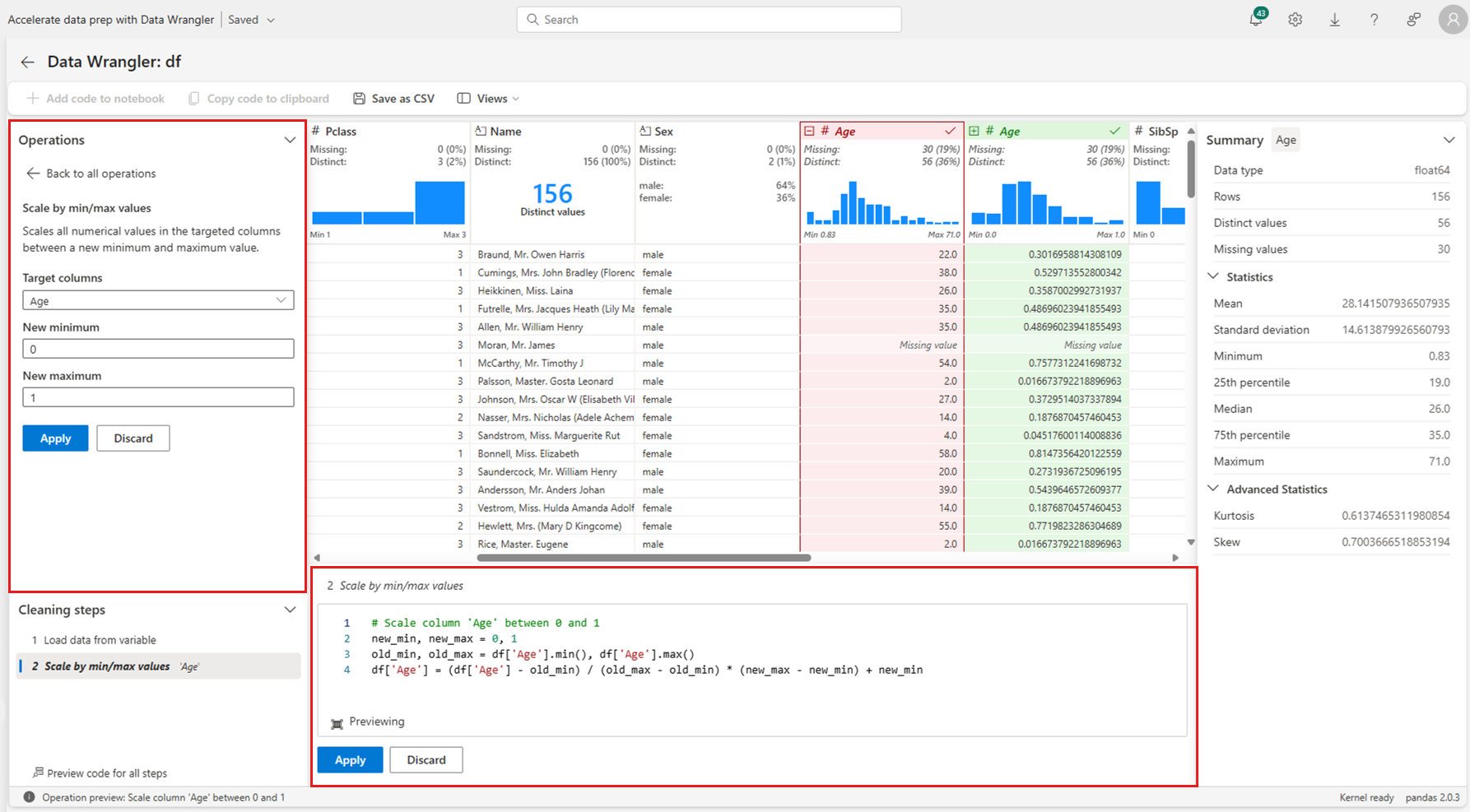 The Data Wrangler display grid automatically previews the results of a selected operation, and the corresponding code automatically appears in the panel below the grid. To commit the previewed code, select Apply in either location. To delete the previewed code and try a new operation, select Discard as shown in this screenshot: