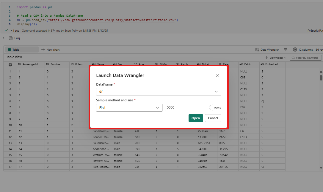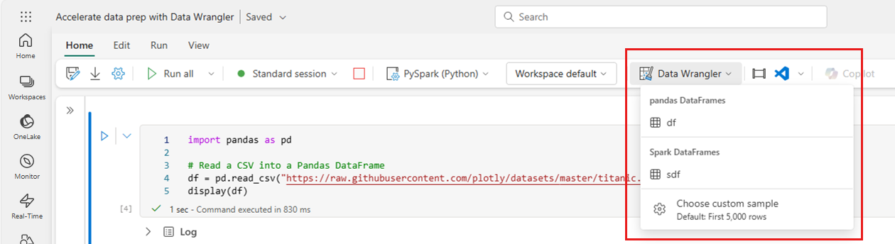 You can launch Data Wrangler directly from a Microsoft Fabric notebook to explore and transform any pandas or Spark DataFrame.