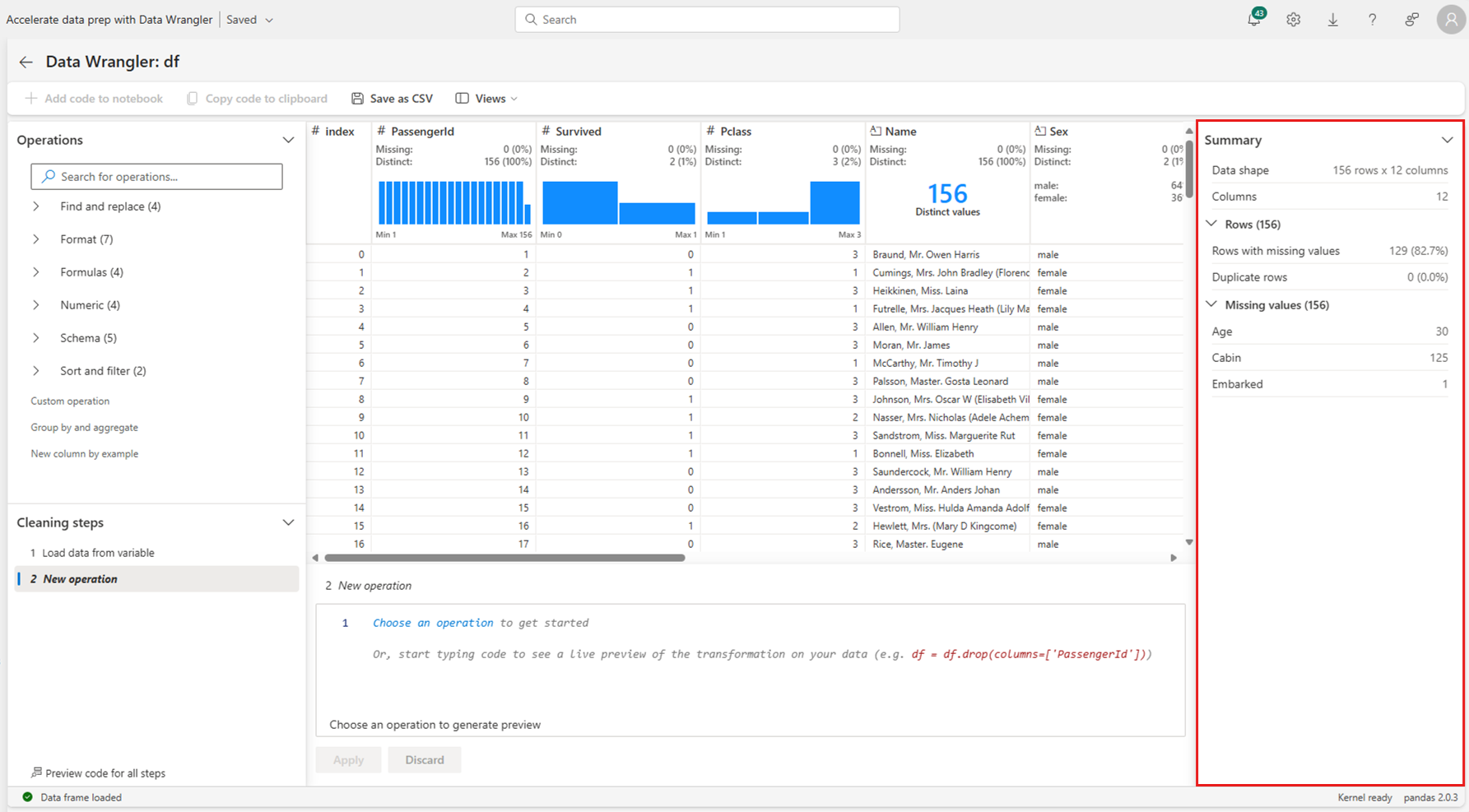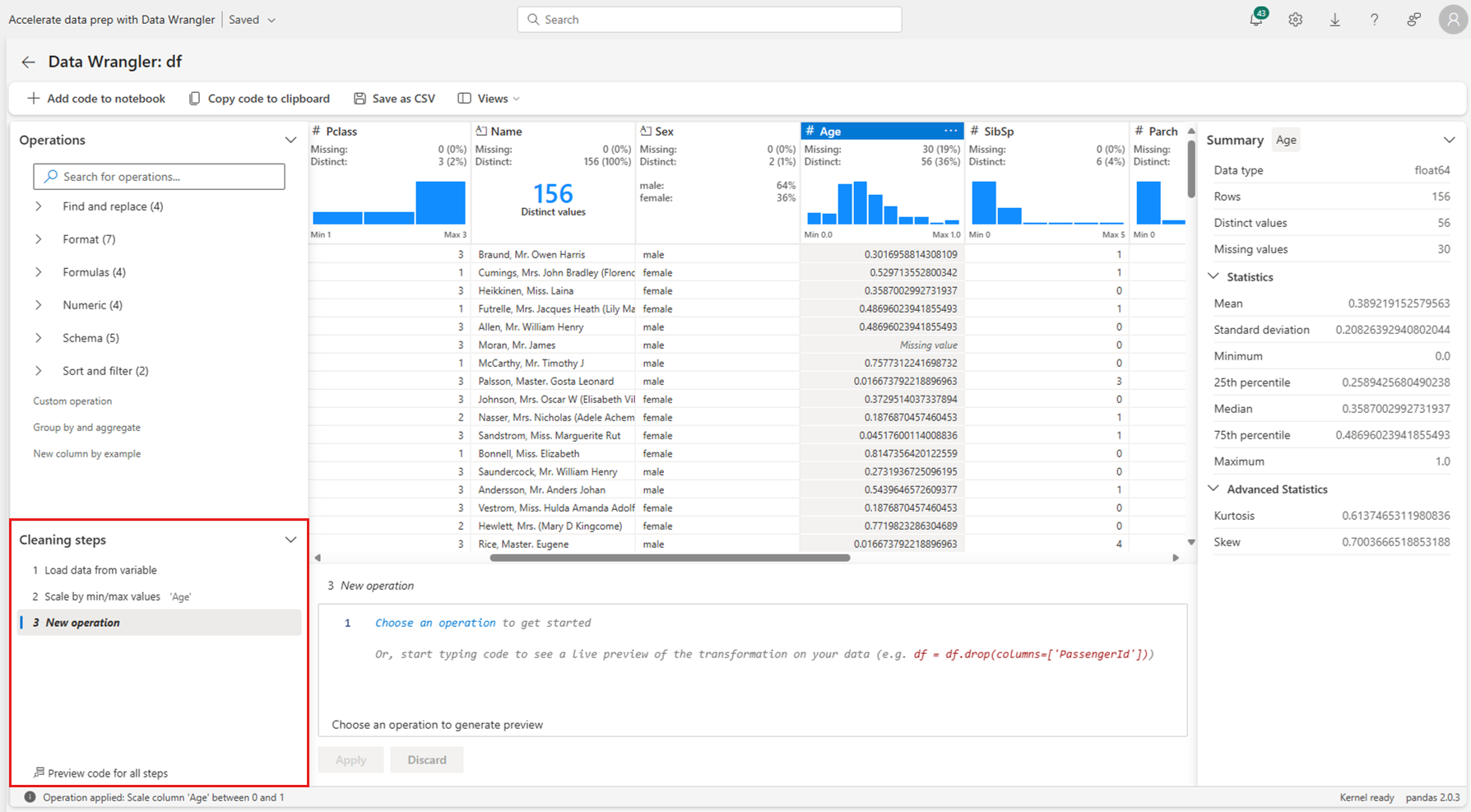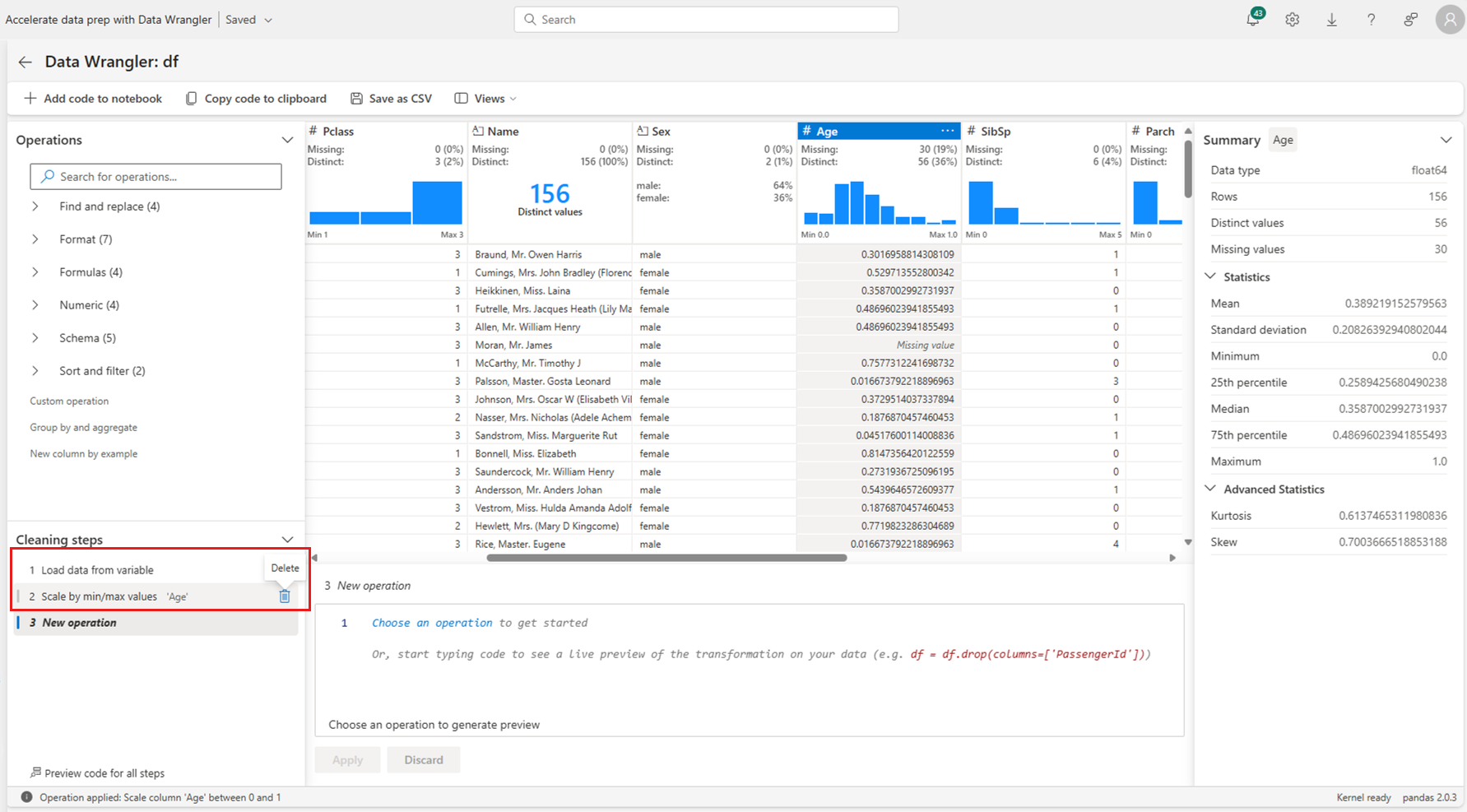 Once you apply an operation, the Data Wrangler display grid and summary statistics update to reflect the results. The code appears in the running list of committed operations in the Cleaning steps panel, as shown in this screenshot: