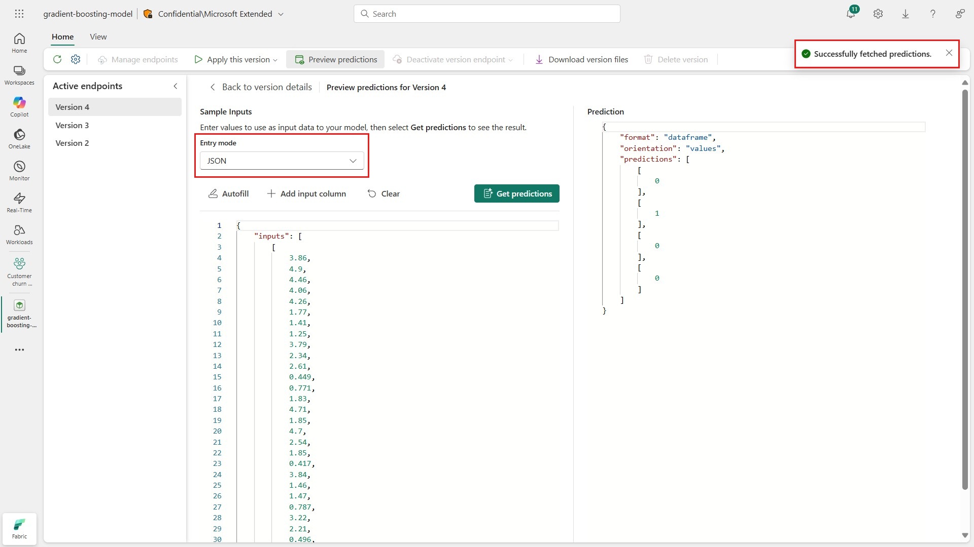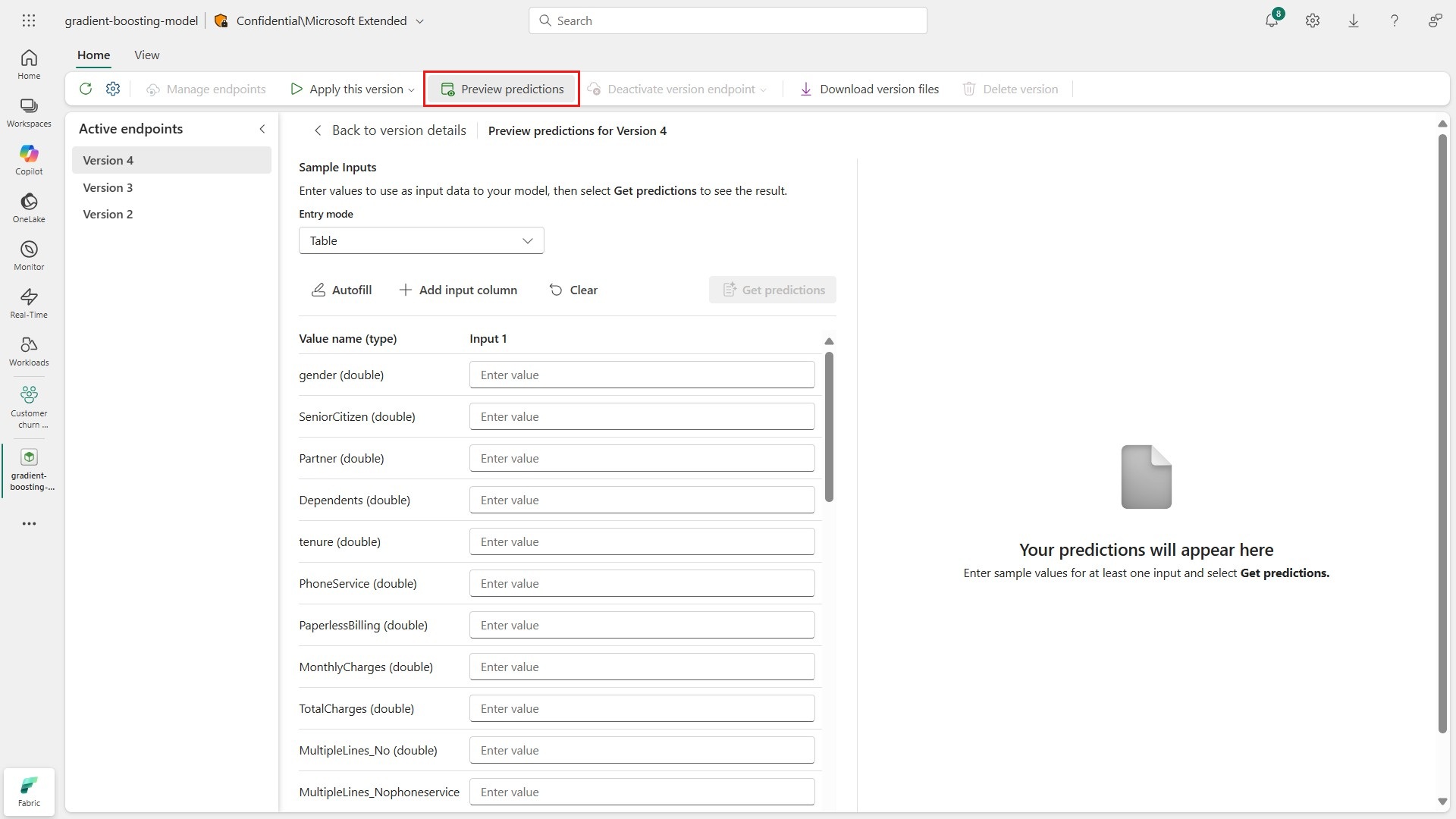 Model endpoints are available for instant testing with a low-code experience in Fabric. Navigate to a version with an active endpoint and select "Preview predictions" from the ribbon in the interface. You can send sample requests to the endpoint—and get sample predictions in real-time—using form fields that match the model’s input signature.