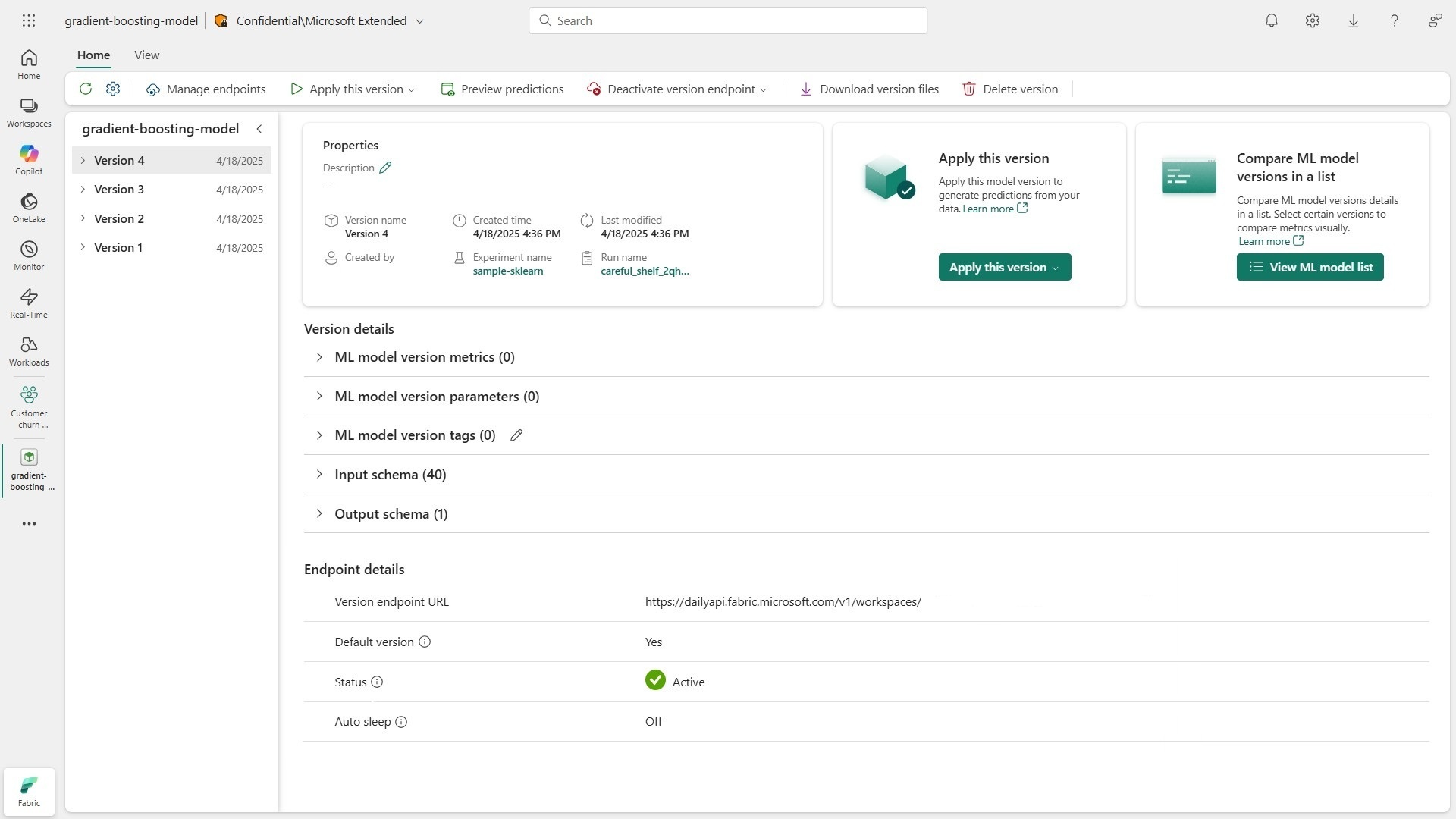 You can activate model endpoints directly from the Fabric interface. Navigate to the version that you’d like to serve real-time predictions and select "Activate version endpoint" from the ribbon.