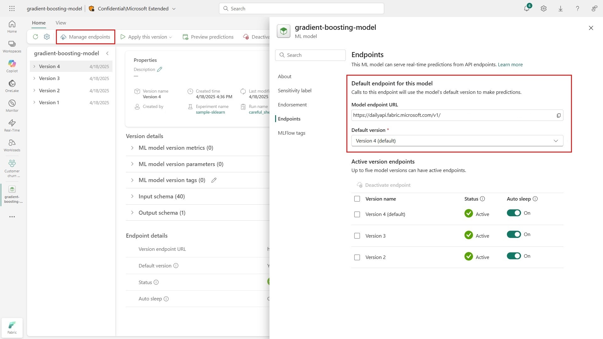 For an overview of your model's active endpoints, select "Manage endpoints" from the ribbon in the interface. Every model has a customizable default endpoint, which serves predictions from a version that you choose. You can update the default version using the dropdown selector in the settings pane.