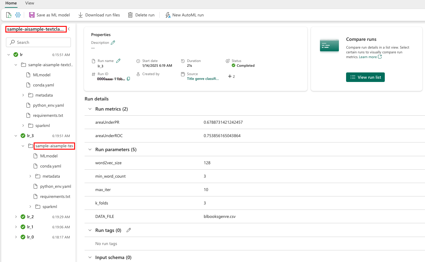 - Find and select the experiment name - in this case, sample_aisample-textclassification