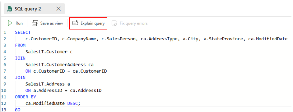 The Fix quick action fixes errors in your query syntax or logic. After running a SQL query and being met with an error, you can fix your queries easily. Copilot automatically takes the SQL error message into context when fixing your query. Copilot also leaves a comment indicating where and how it has edited the T-SQL code.