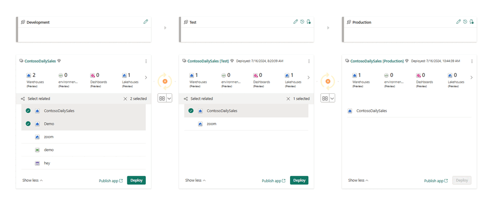 - Select Deploy to deploy your warehouses across the Development, Test, and Production stages.