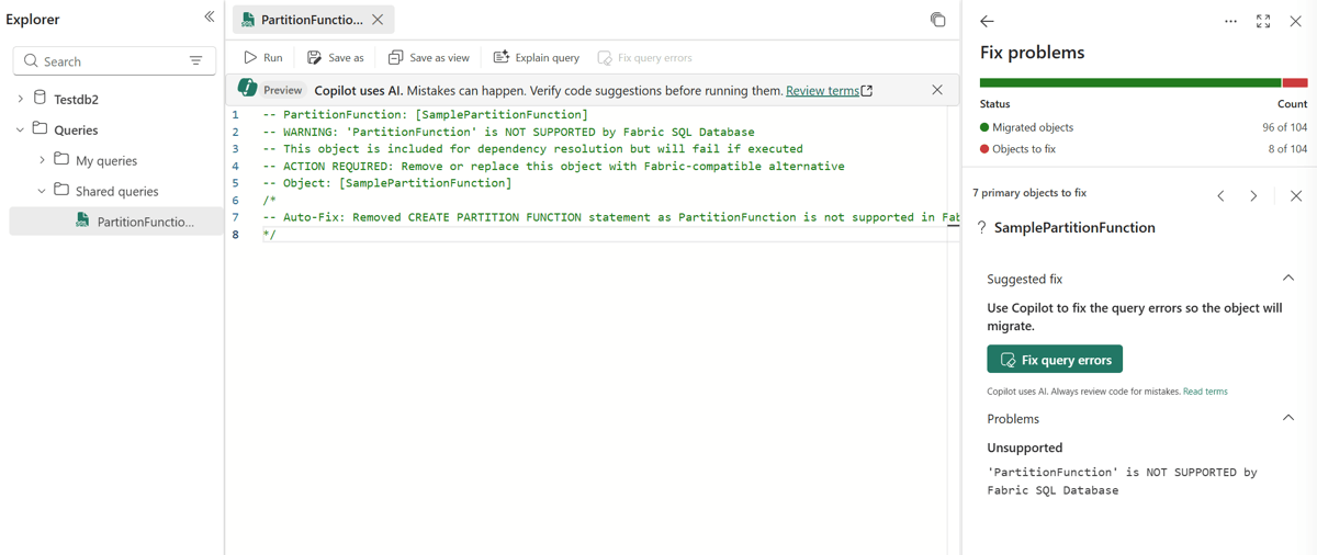 For example, you might see identified syntax incompatibilities and the Fix query errors button to provide a T-SQL script fix or workaround.