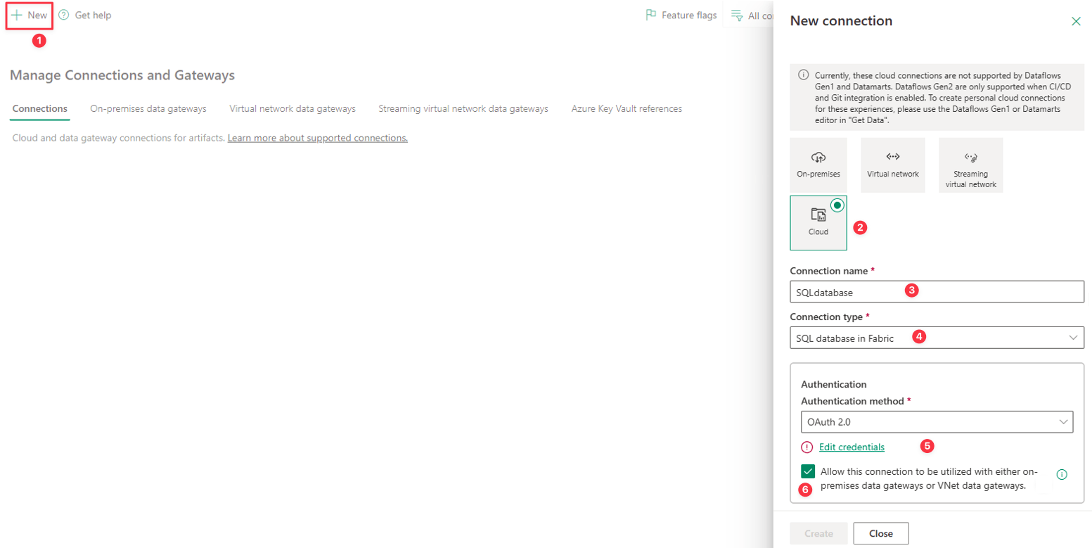 After registering an on-premises data gateway, create a Fabric SQL connection and enable it for gateway usage.