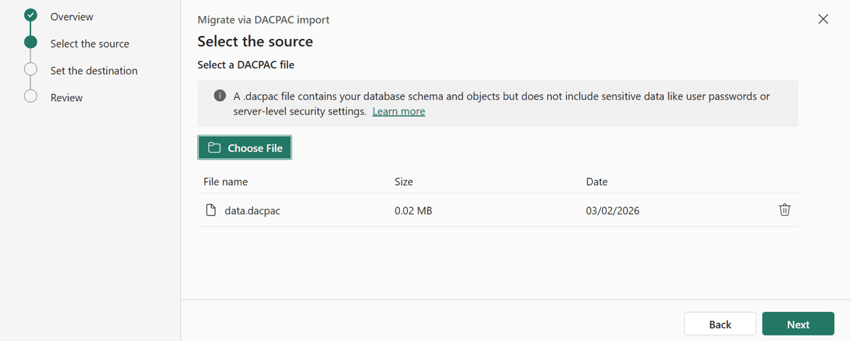 On the Select the source page, upload the DACPAC file from the source SQL Server environment.