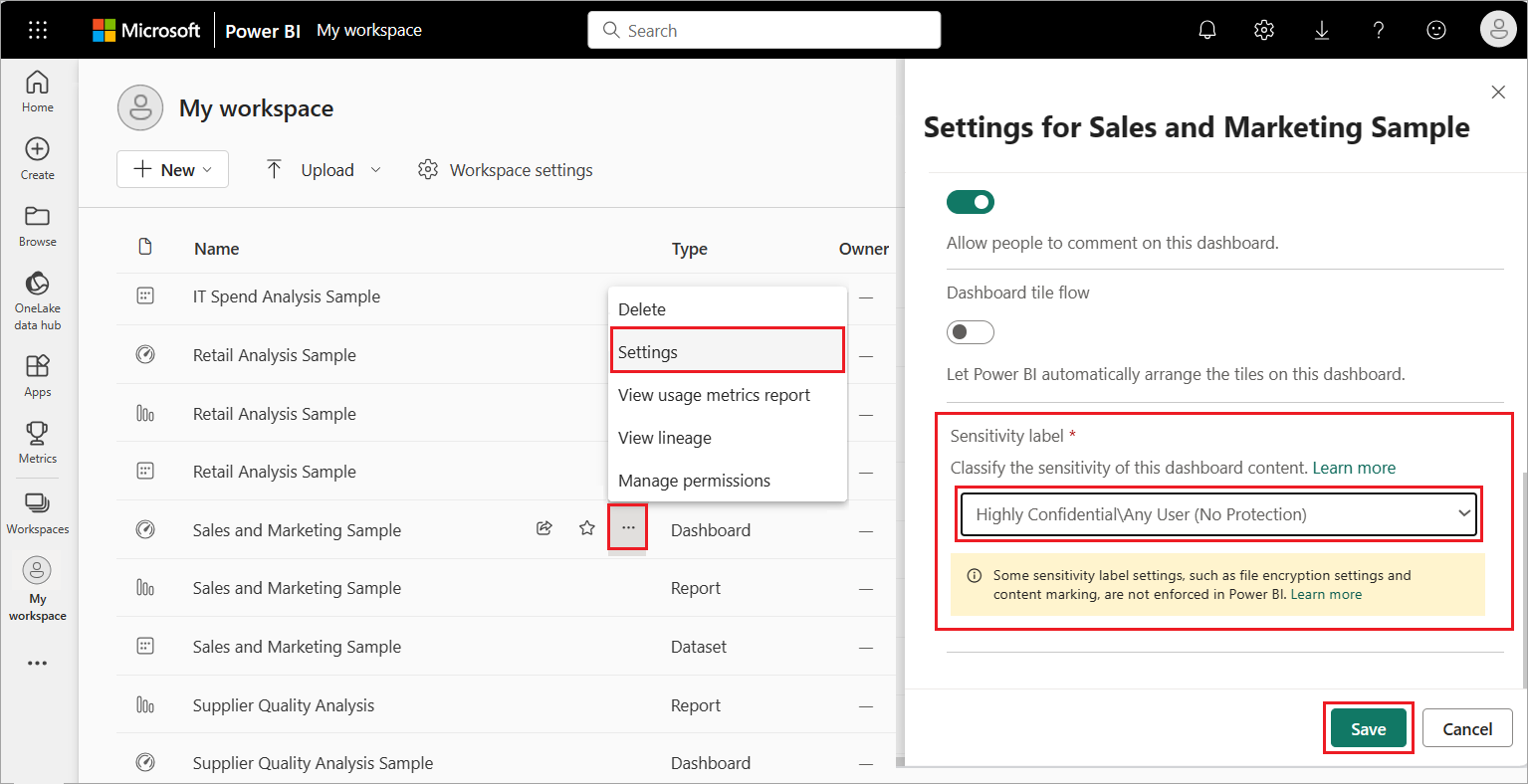 You can apply or change the sensitivity label on a report or dashboard by following these steps: