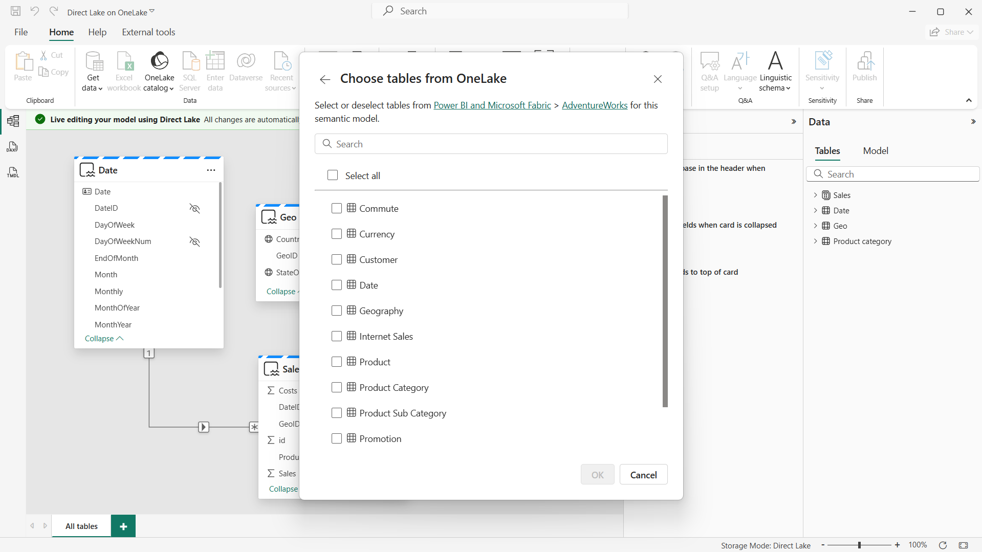 This article discusses more details about live editing in Power BI Desktop, and how to create and add Direct Lake tables to a semantic model in Power BI Desktop.