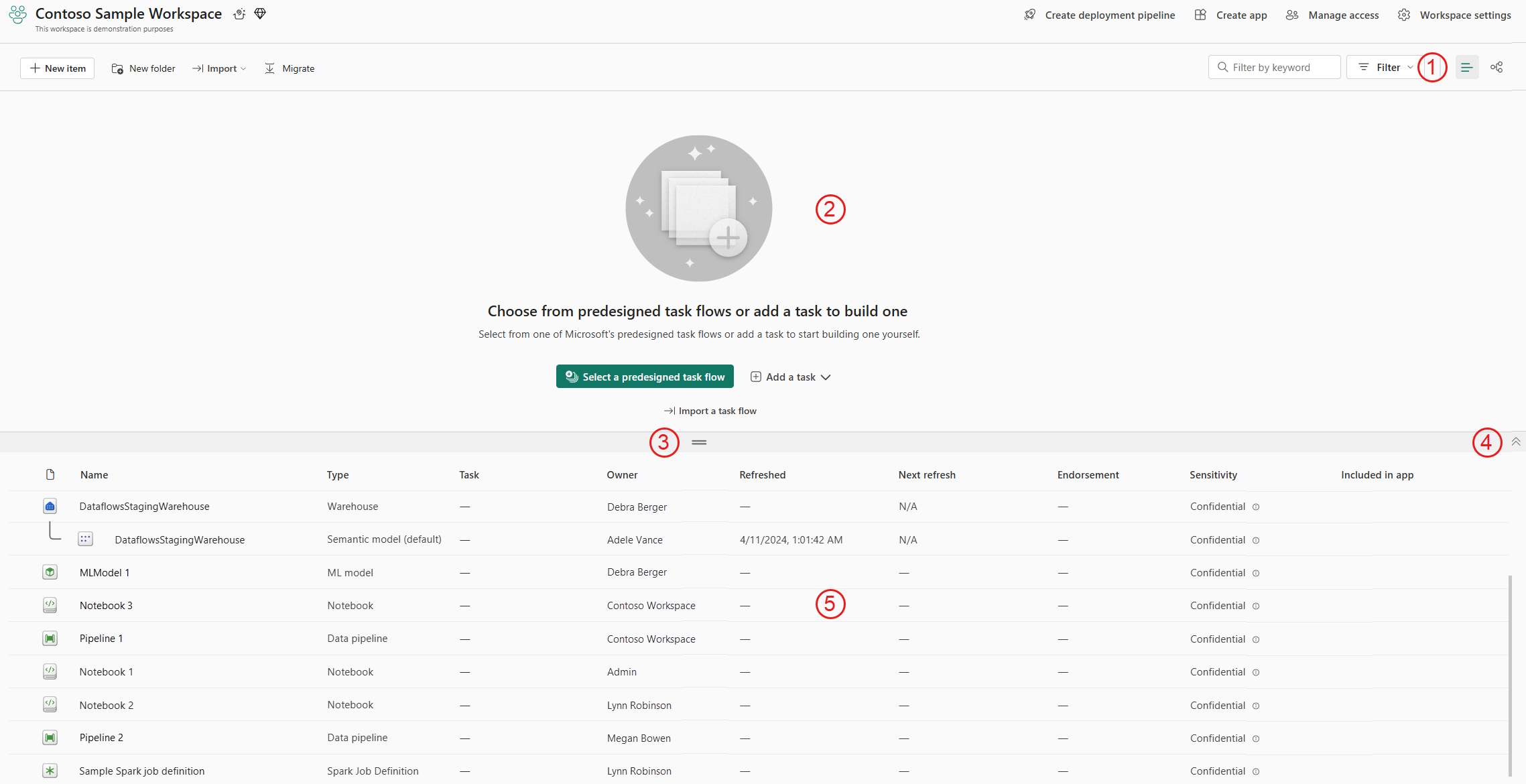 The items list shows all the items and folders in the workspace, including those items that are assigned to tasks in the task flow. When you select a task in the task flow, the items list is filtered to show just the items that are assigned to the selected task.
