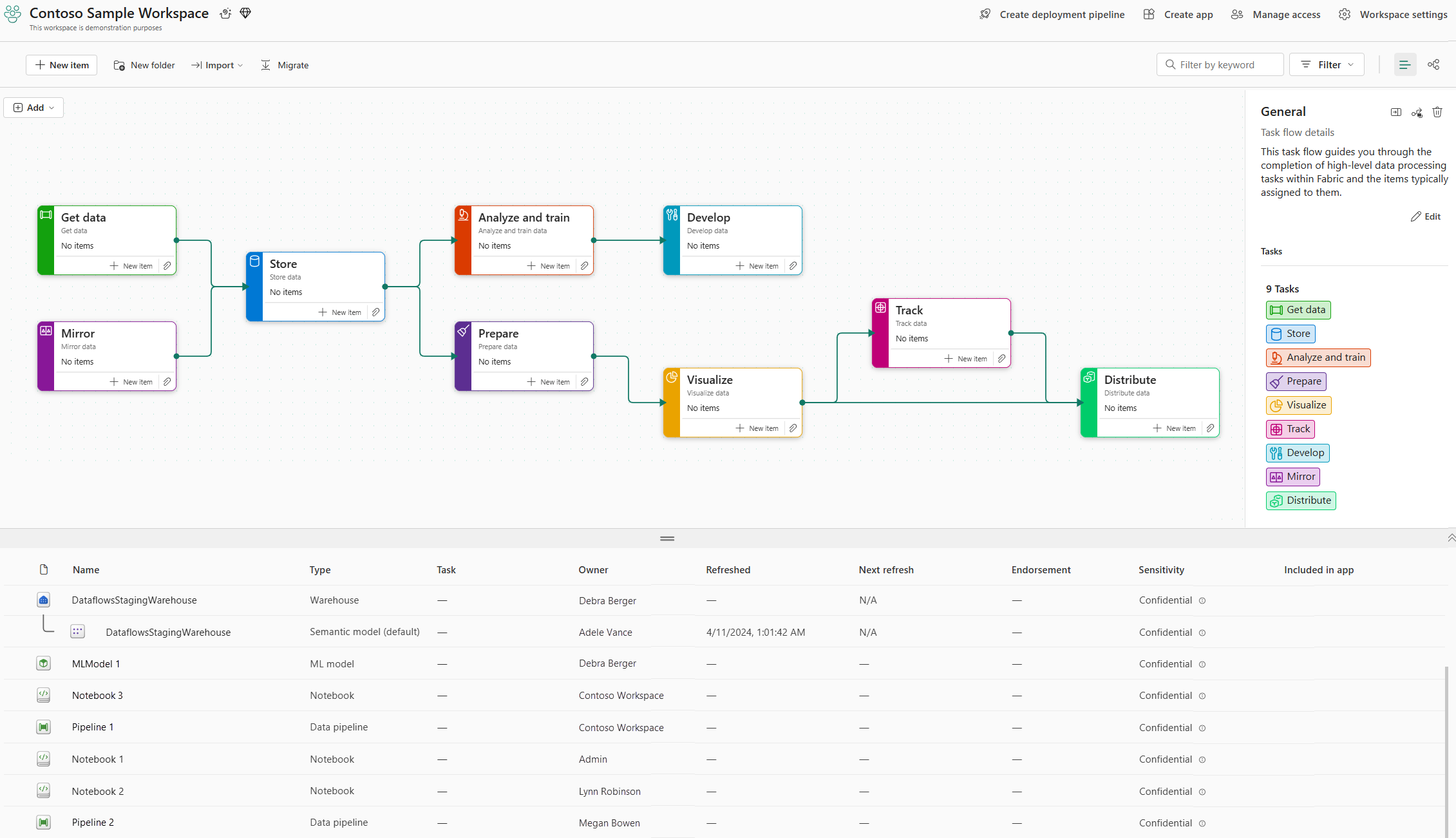 The side pane lists the predesigned task flows provided by Microsoft. Each predefined task flow has a brief description of its use case. When you select one of the flows, you'll see a more detailed description of the flow and how to use it, and also the workloads and item types that the flow requires.