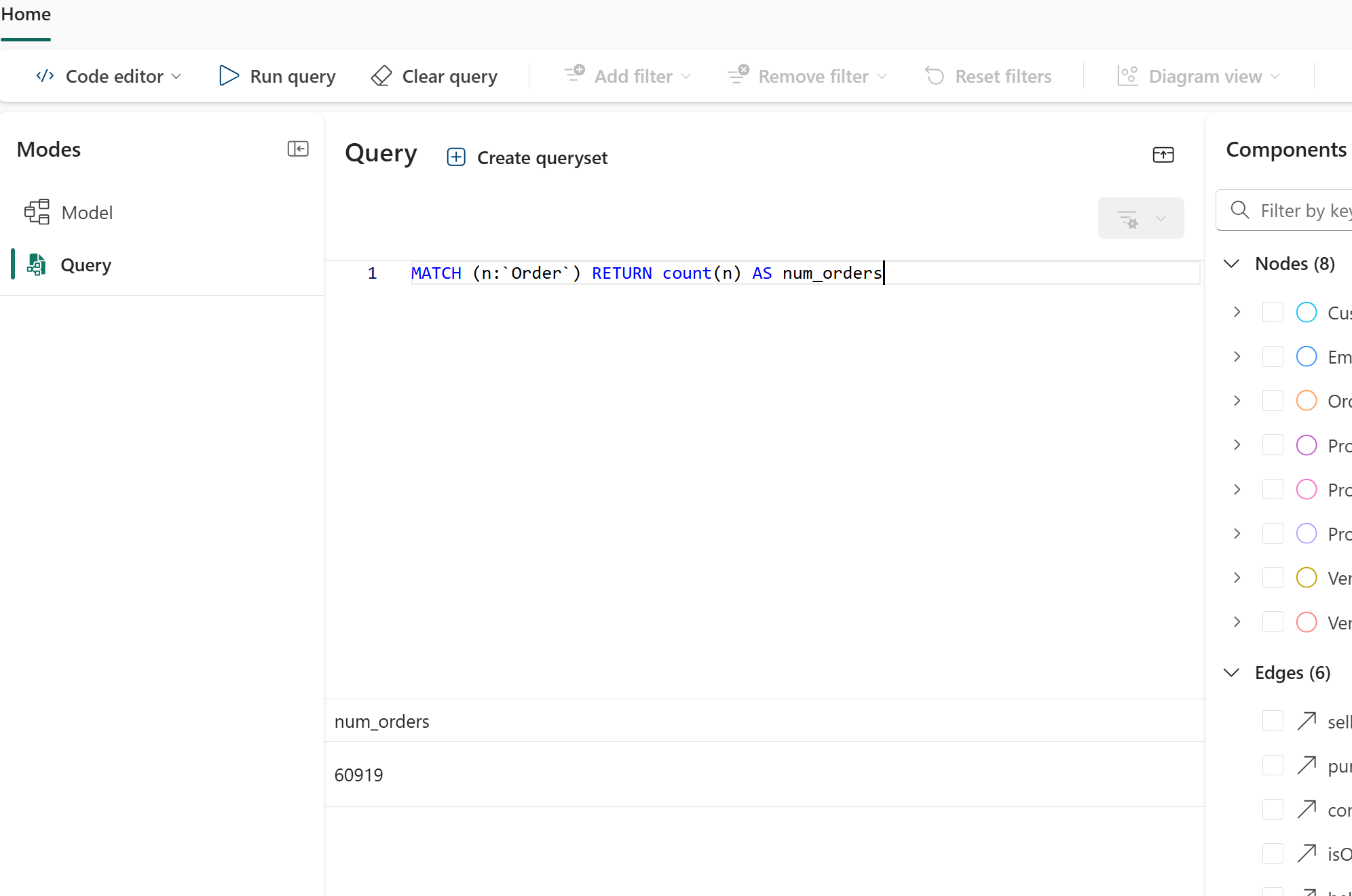 This query finds all nodes with the Order label, counts them, and returns the total as num_orders. It's a simple way to confirm your graph has data and that the count matches the number of order rows you loaded. The following image shows the result of the query: