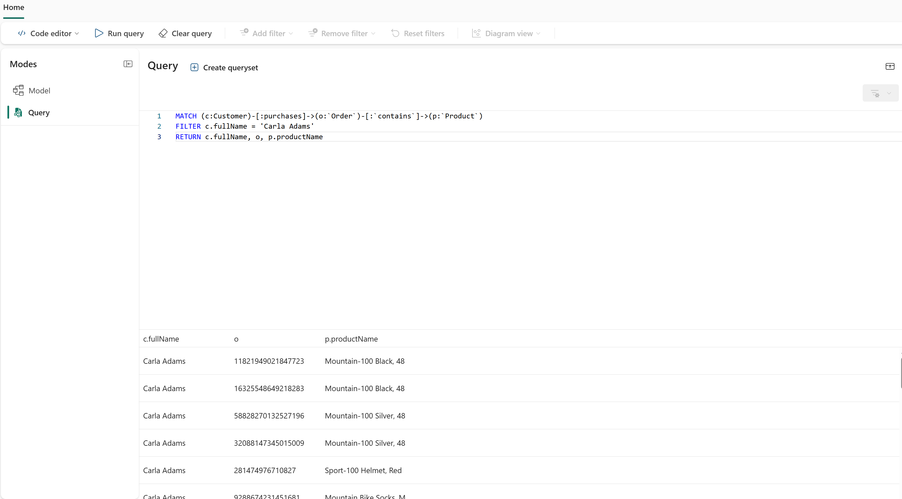 In the previous tutorial step, you used the query builder to find what products a specific customer purchased. Here's the same query written in GQL: