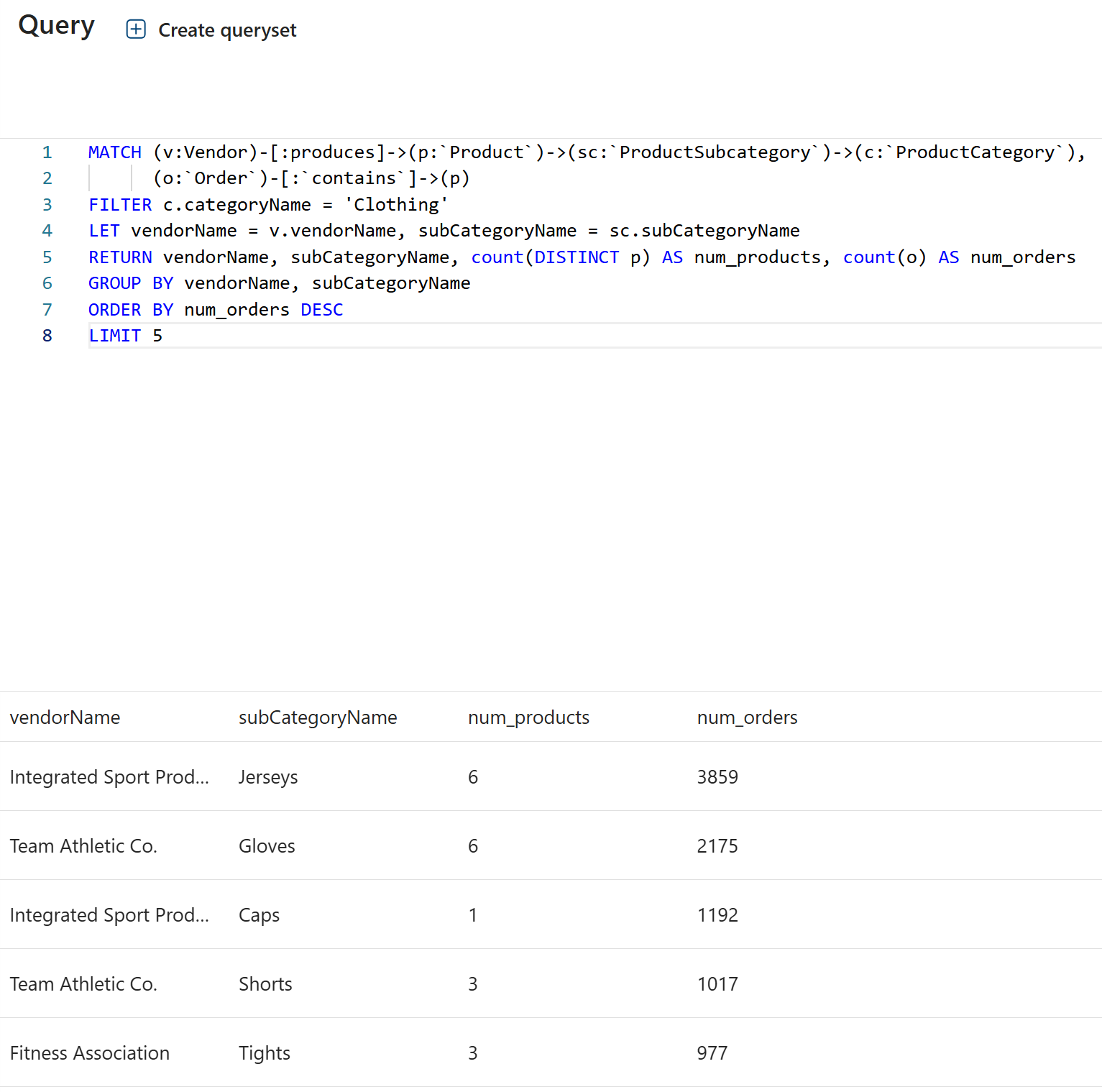 Screenshot showing the result of running a GQL query to find the top five vendors supplying products in the Clothing category.