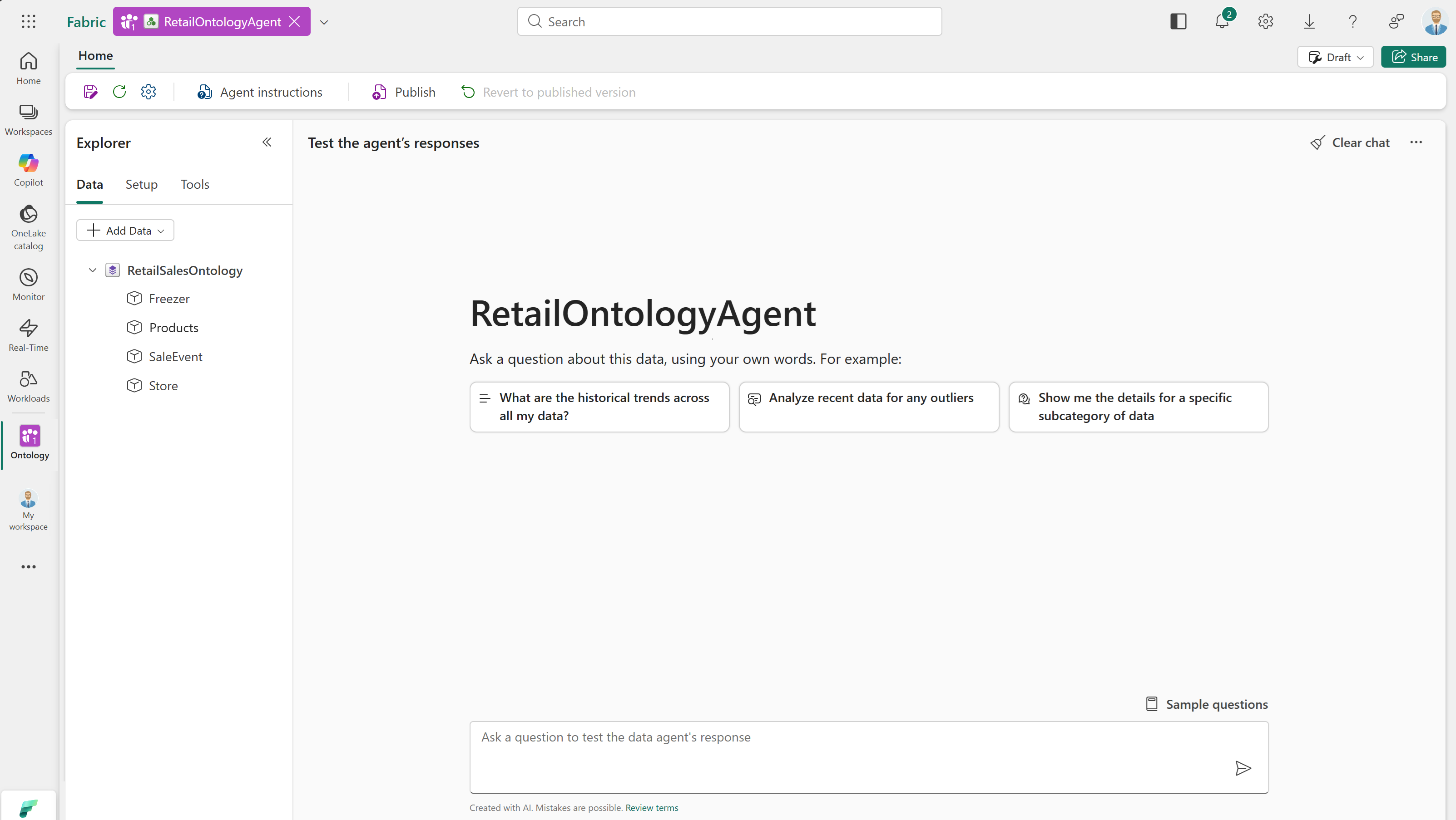 Add RetailSalesOntology as a data source for the data agent. For detailed instructions, see Create a Fabric data agent (preview).