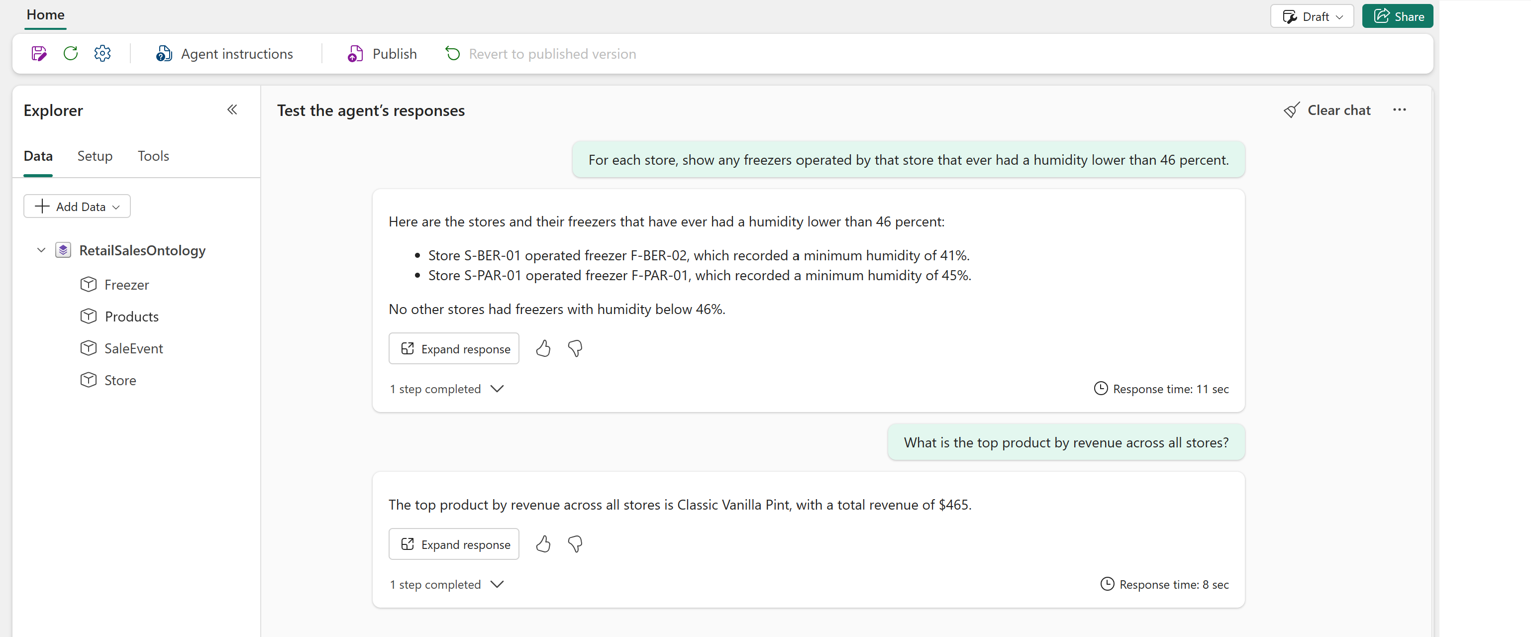 Notice that the responses reference entity types (Store, Products, Freezer) and their relationships, not just raw tables.