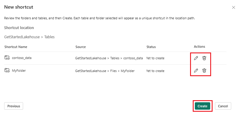Review your selected shortcut locations. Use the edit action to change the default shortcut name. Use the delete action to remove any undesired selections. Select Create to generate shortcuts.