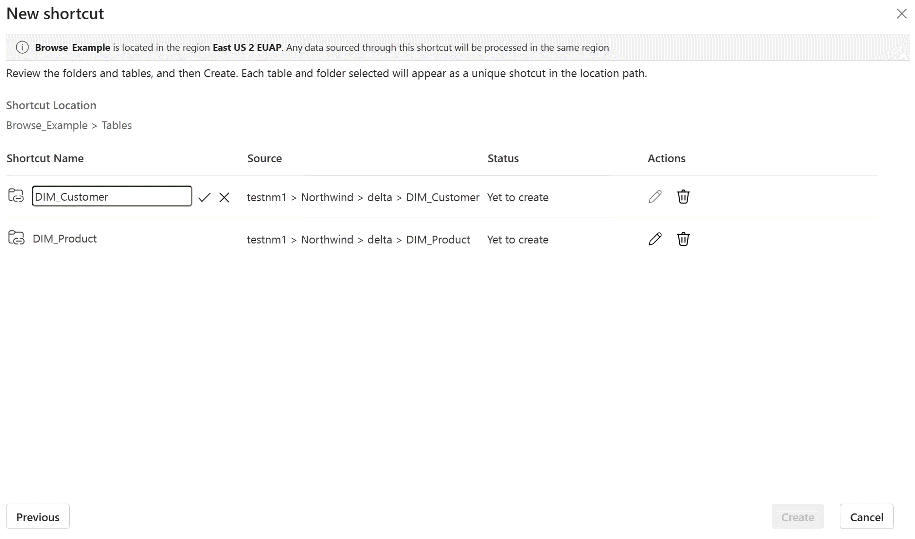 The review page allows you to verify all of your selections. Here you can see each shortcut that will be created. In the action column, you can click the pencil icon to edit the shortcut name. You can click the trash can icon to delete shortcut.