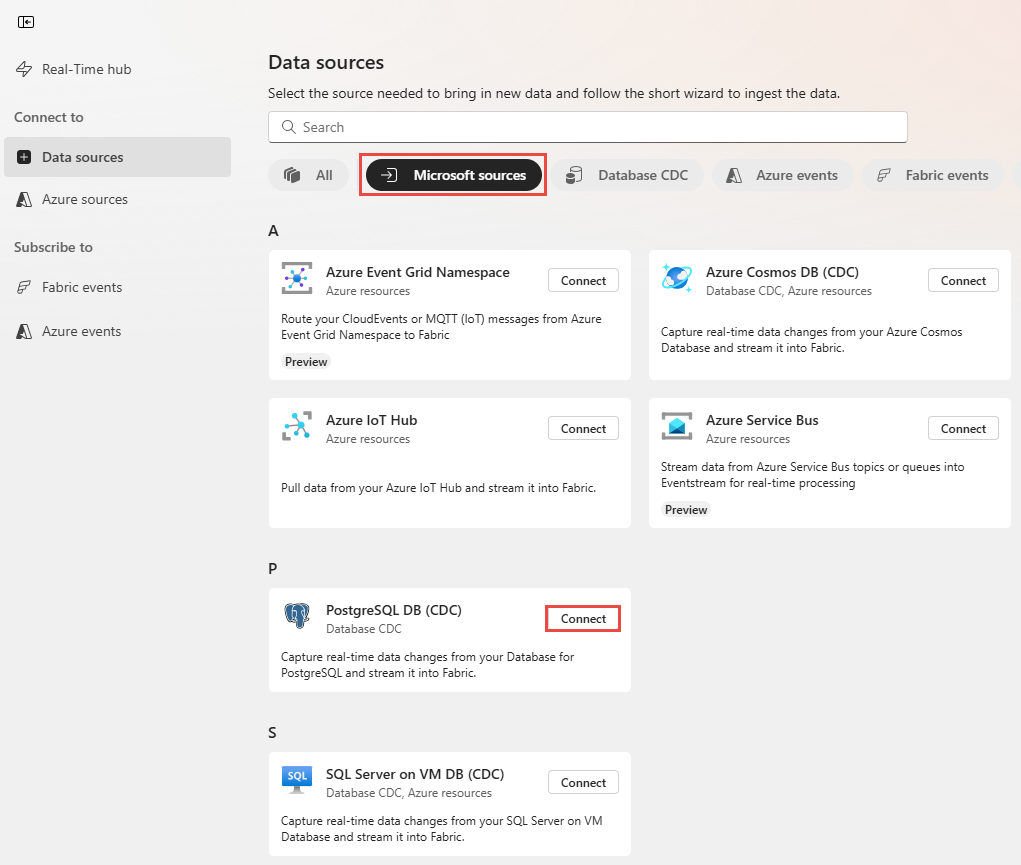 On the Data sources page, select Microsoft sources category at the top, and then select Connect on the Azure DB for PostgreSQL (CDC) tile.
