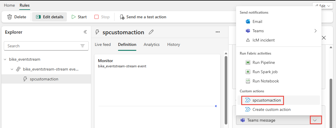 After you create the custom action, in the Definition pane of the rule, select the custom action from the Action drop-down list.