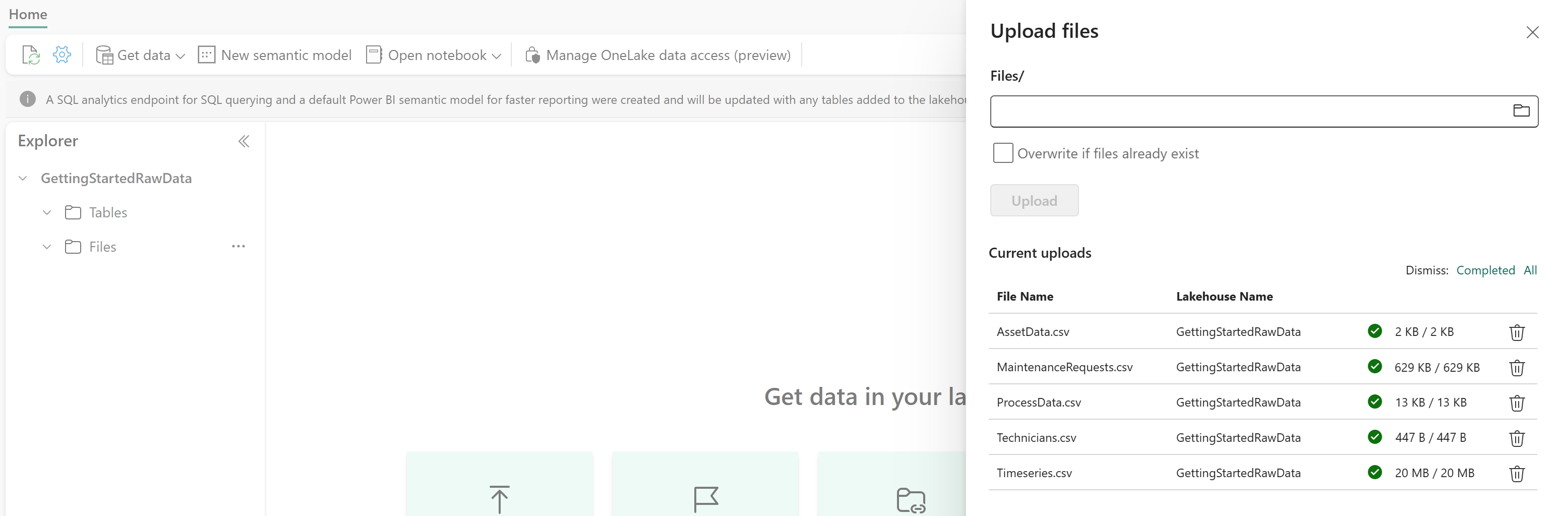 You now have sample data available in your GettingStartedRawData lakehouse. You use the data in this lakehouse throughout this tutorial.