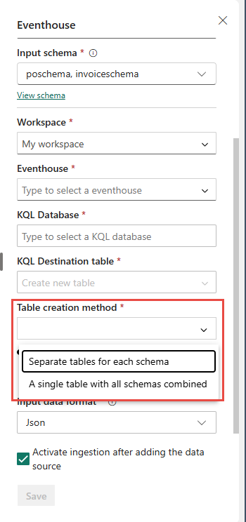 2. For Table creation method, select A single table with all schemas combined or Separate tables for each schema, depending on your requirements.